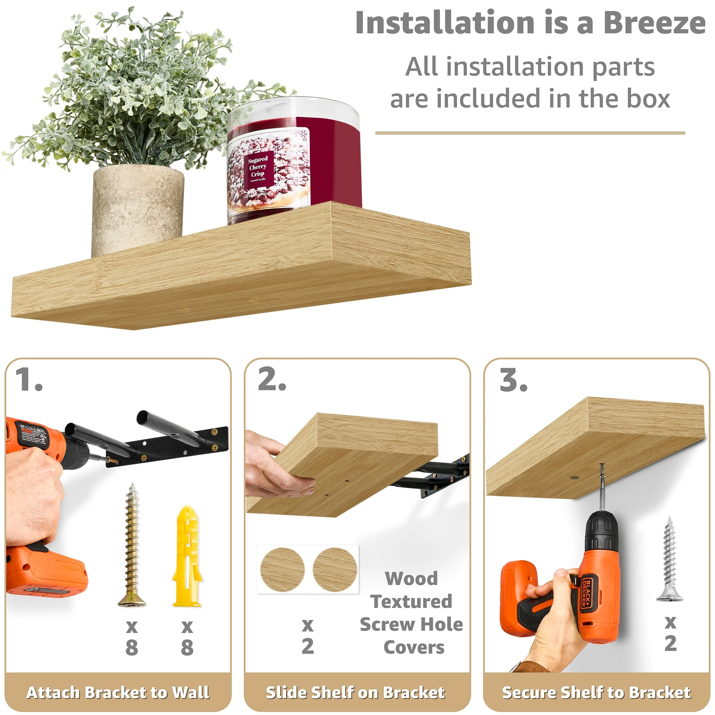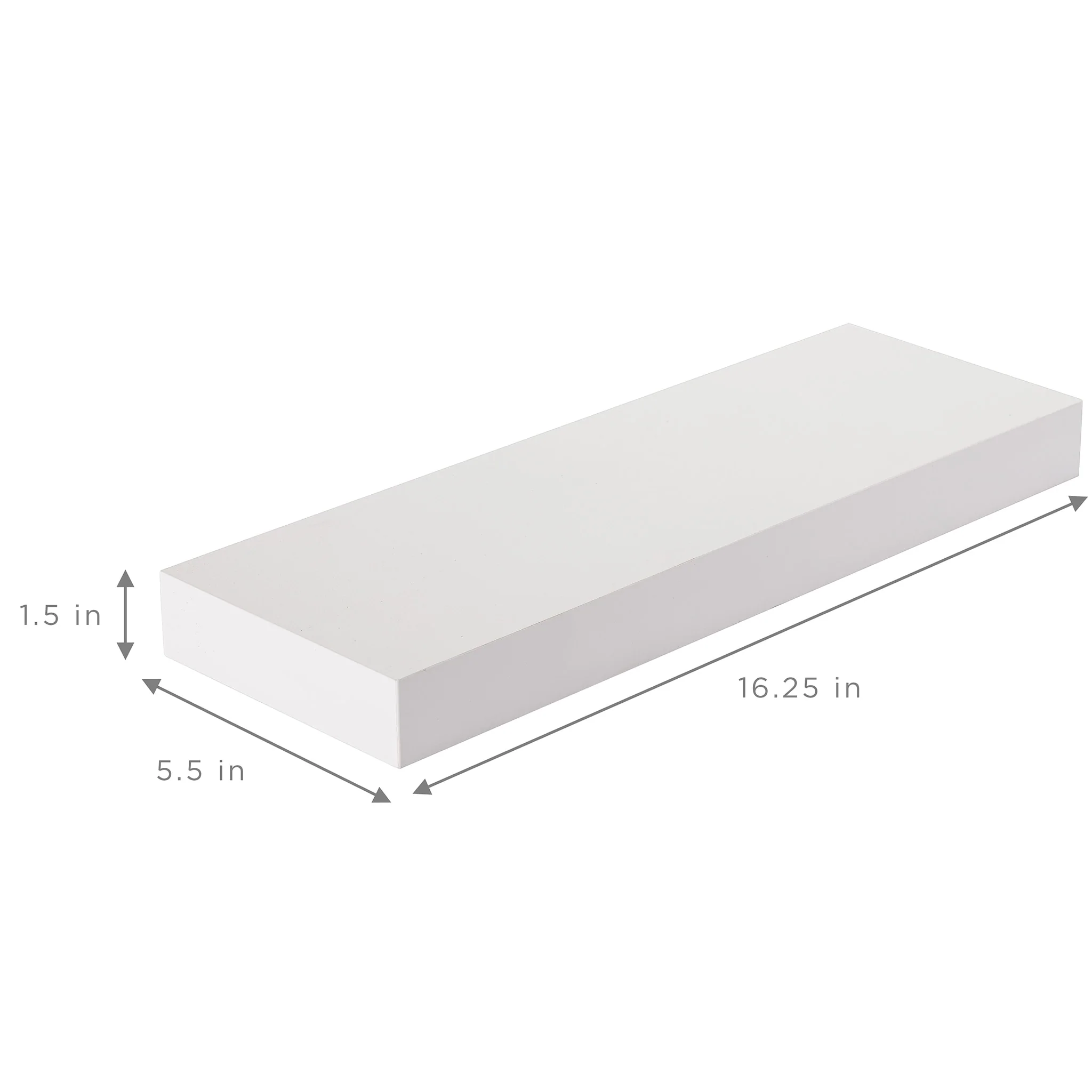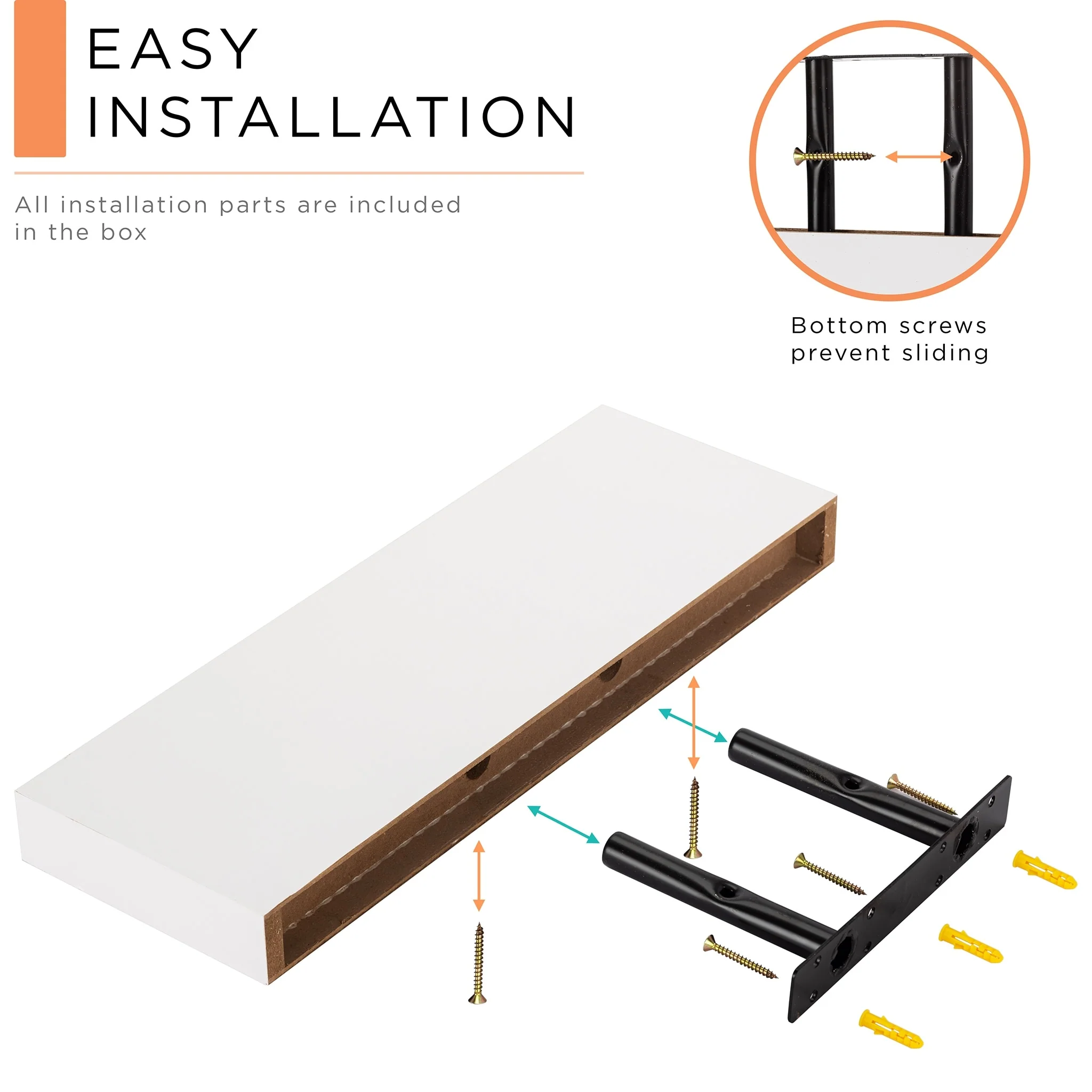 Attaches firmly to wall with minor assembly required for hanging. Mounting hardware INCLUDED. Made of beautiful MDF with PVC + Bracket. Sturdy enough to arrange and display your favorite small objects Supports up to 8 pounds per shelf. Measures approximately 16.25' L x 5.50' W (Each shelf 1.5' thick).