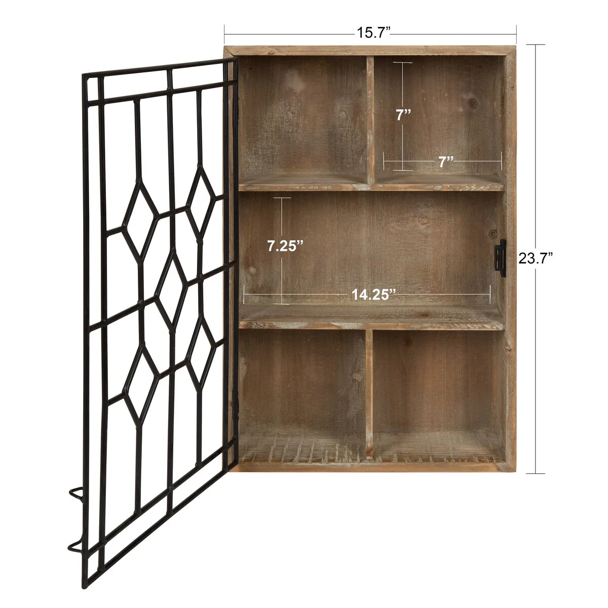 Add some extra storage and display space to any room with this shabby-chic wall cabinet. This wood cupboard features five shelf spaces and a decorative black iron door that keeps items from falling. This cabinet comes fully assembled and ready to hang on the wall.