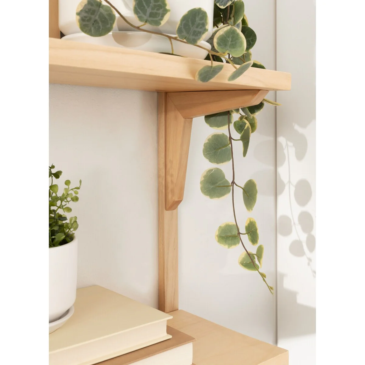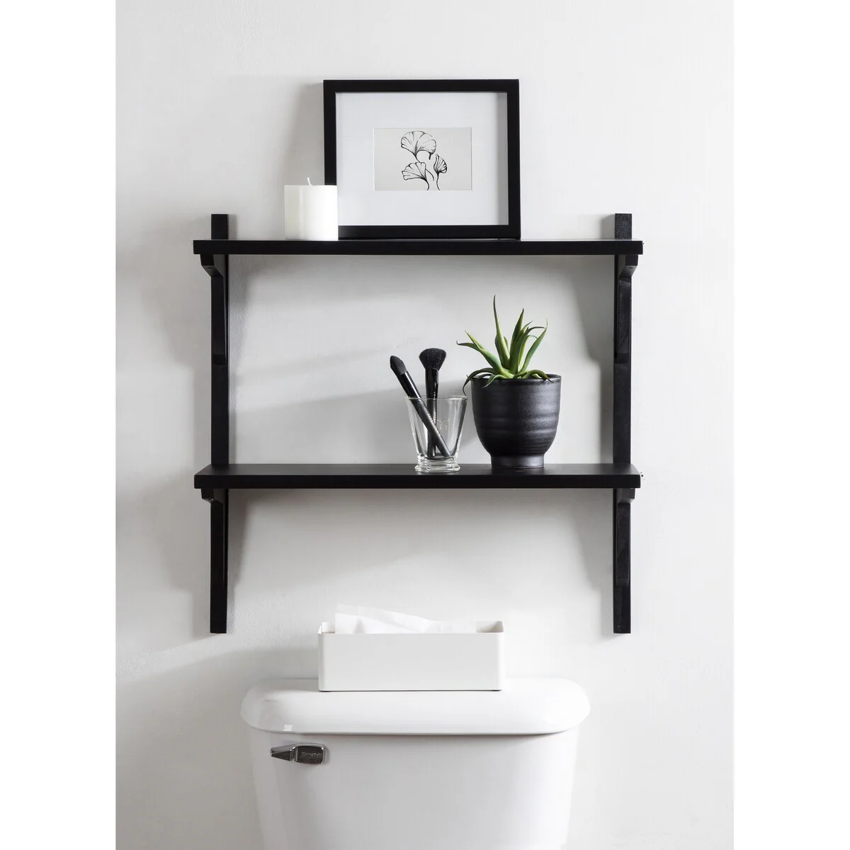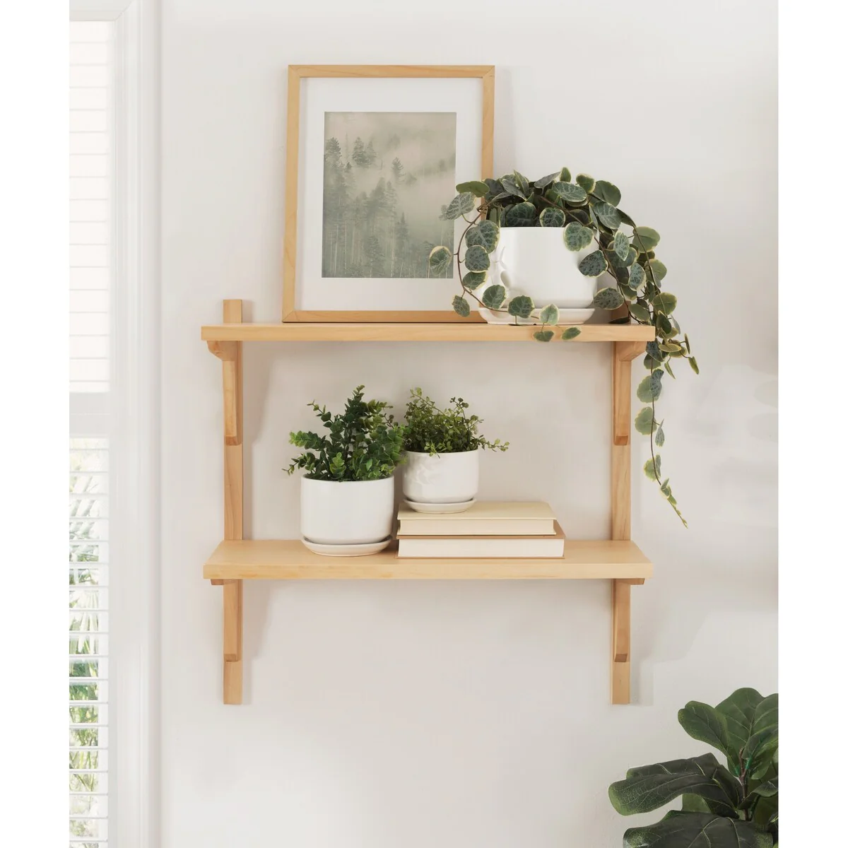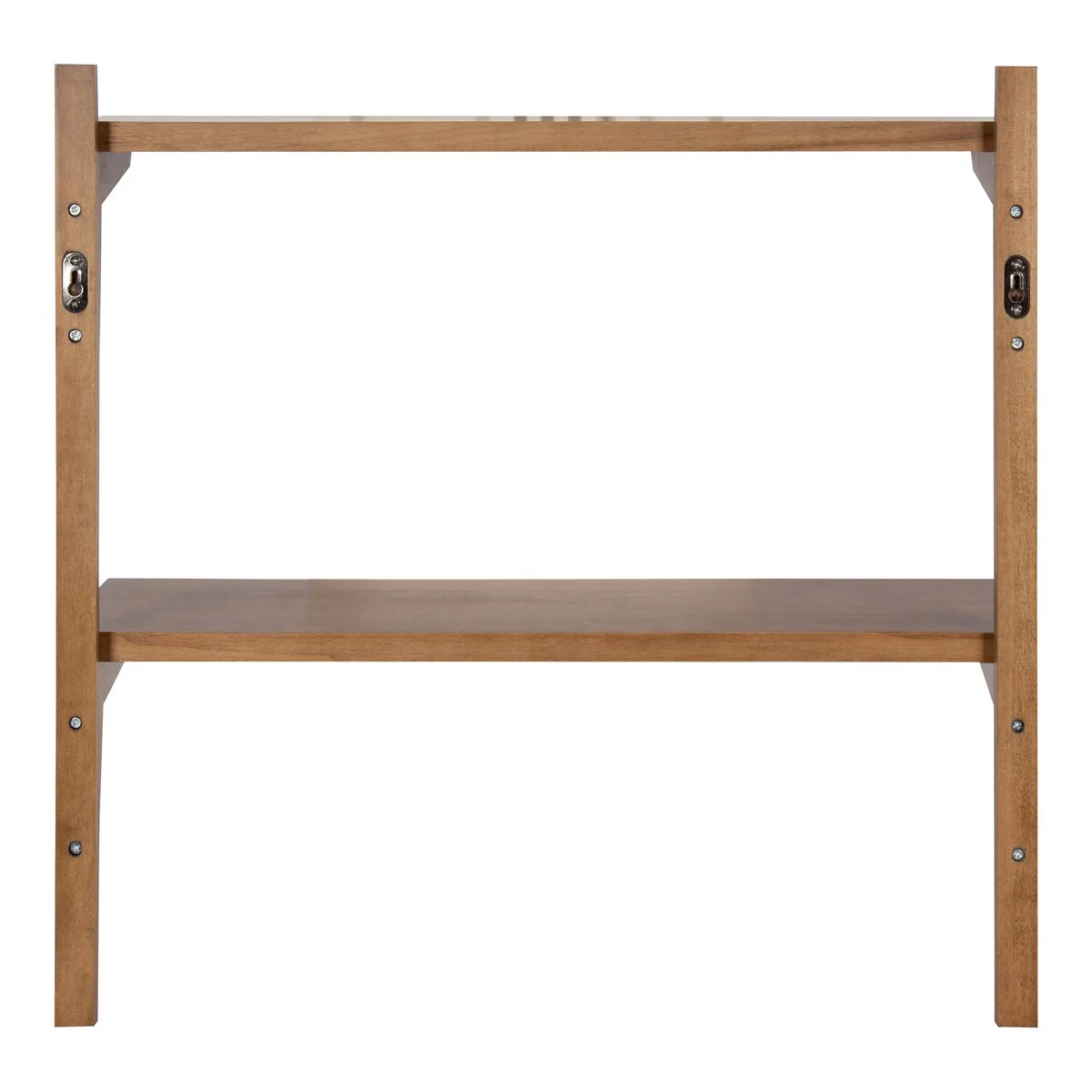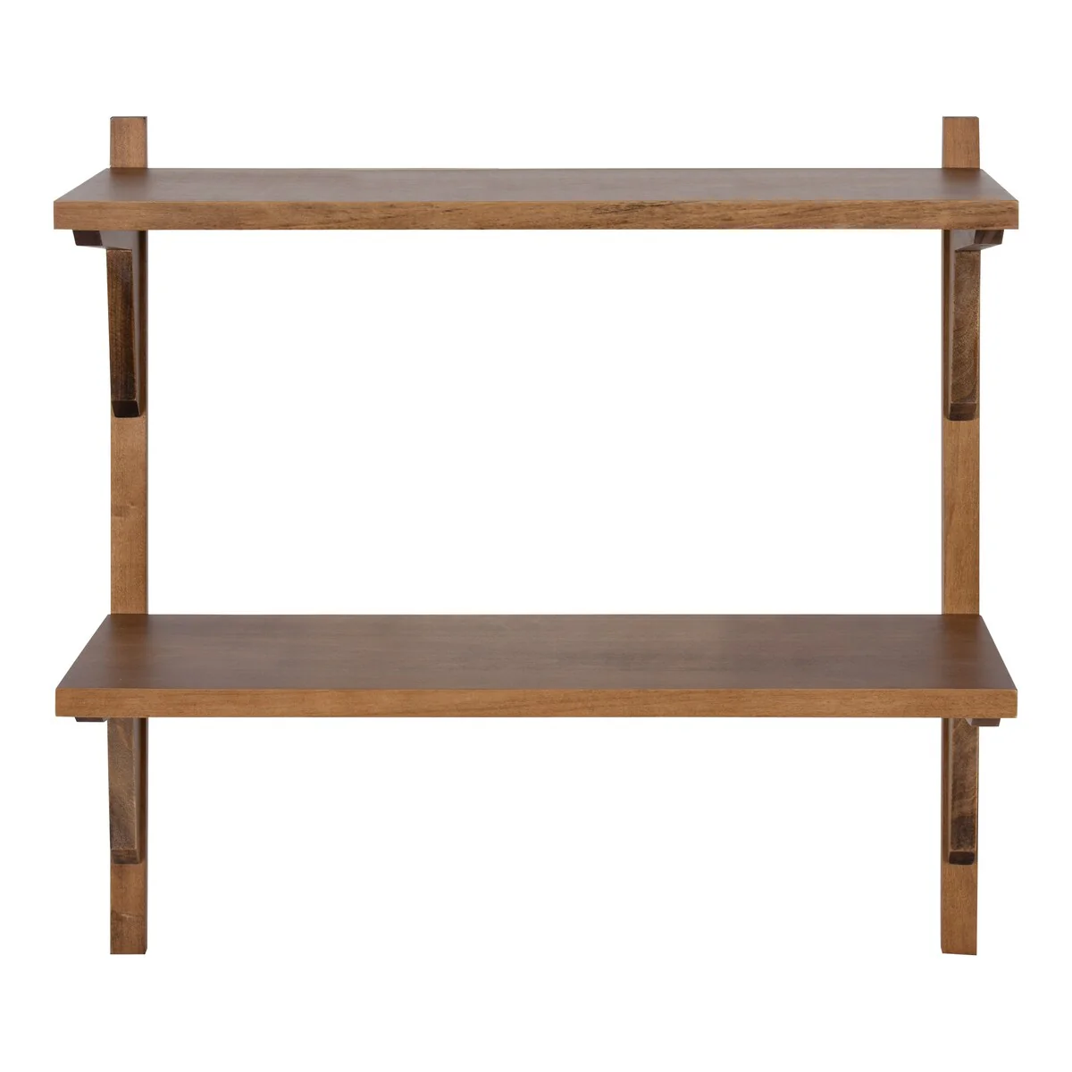 Show off your prized decor with a flair of mid-century style using this Kate and Laurel Meridien wall shelf. Two shelves make up this wooden unit, providing you with multiple levels for displaying artwork, books, framed photos, and any other personal pieces you want to show off. This shelf mounts to the wall with included hardware and keyhole hangers to save floor space, making the unit great for smaller rooms. A warm walnut finish and retro-style brackets give this shelf an olden, transitional look.