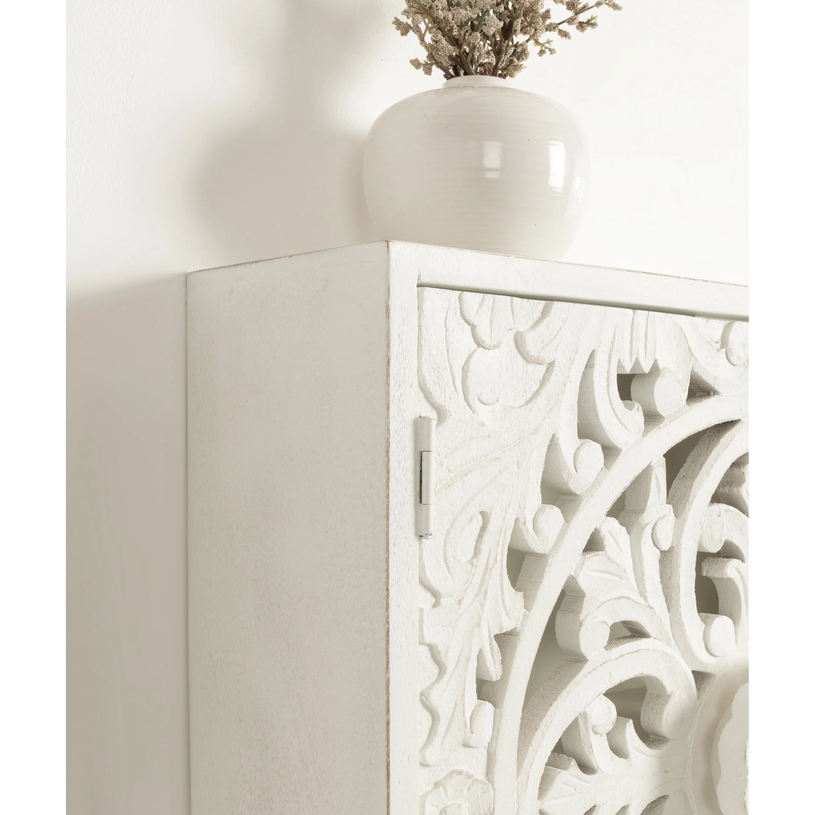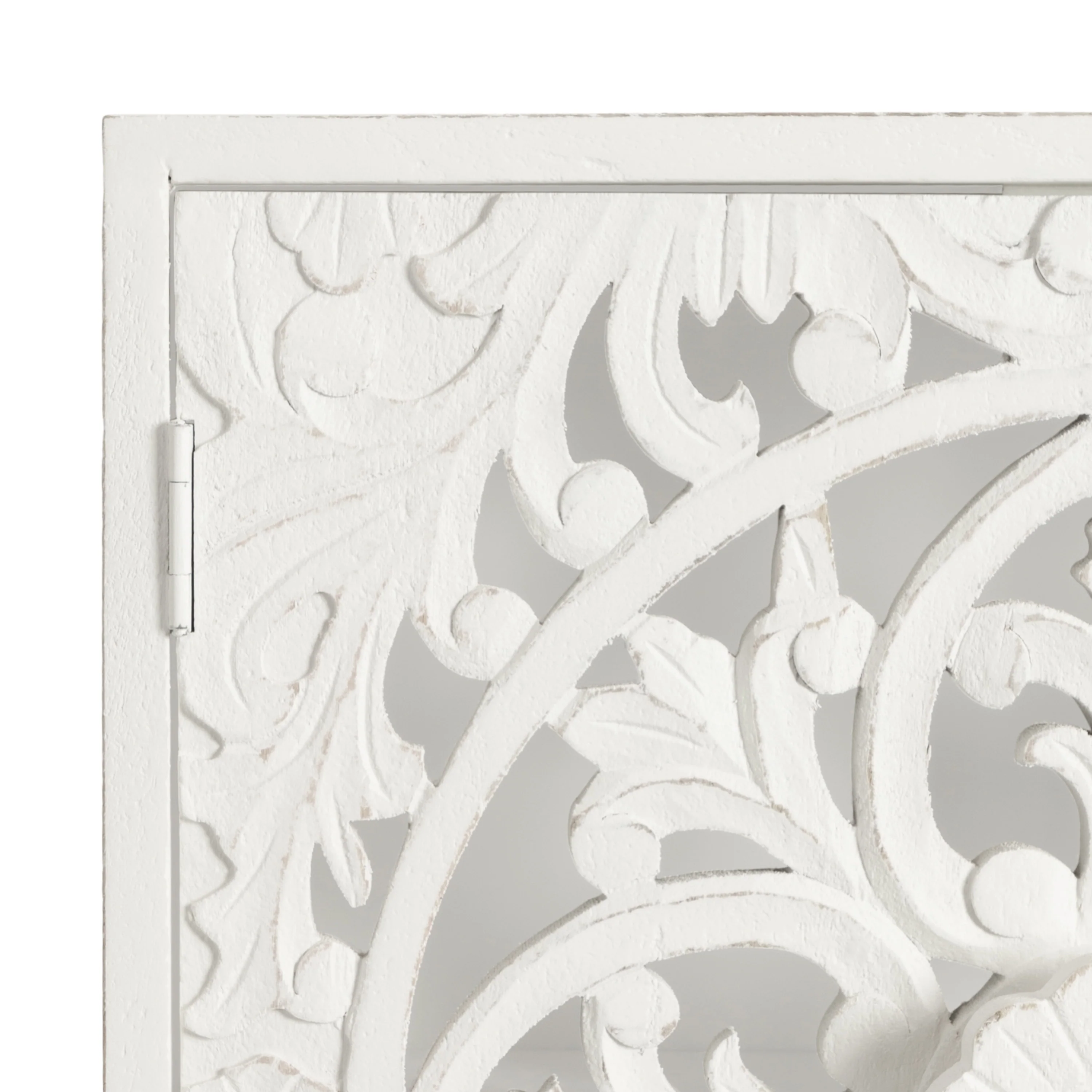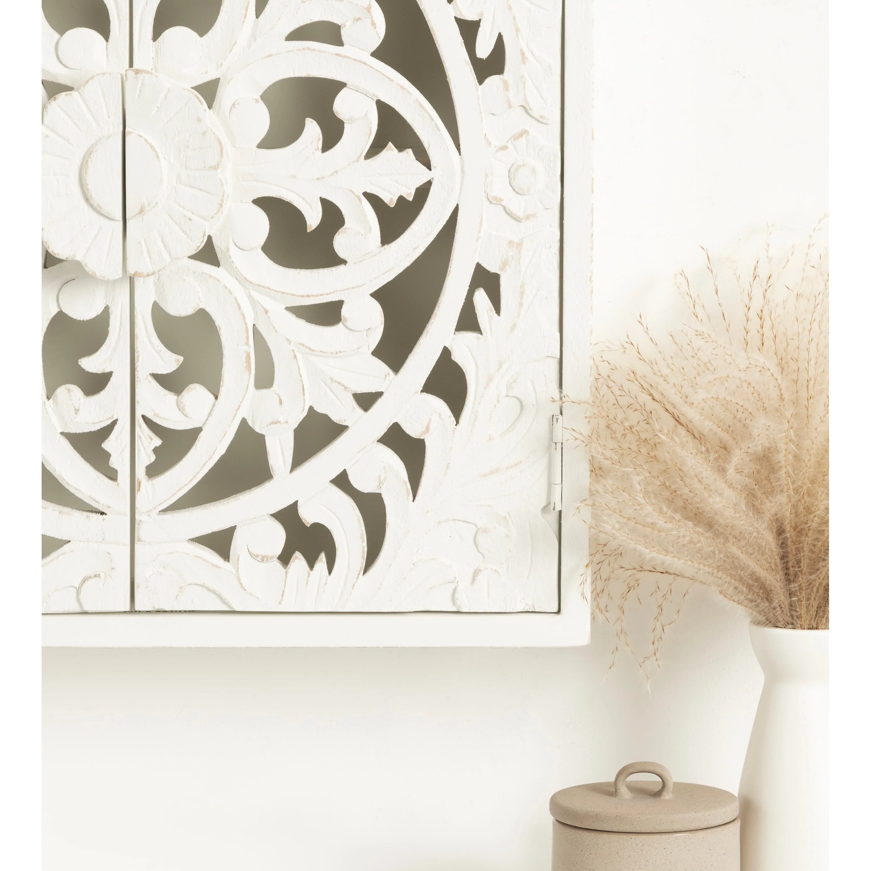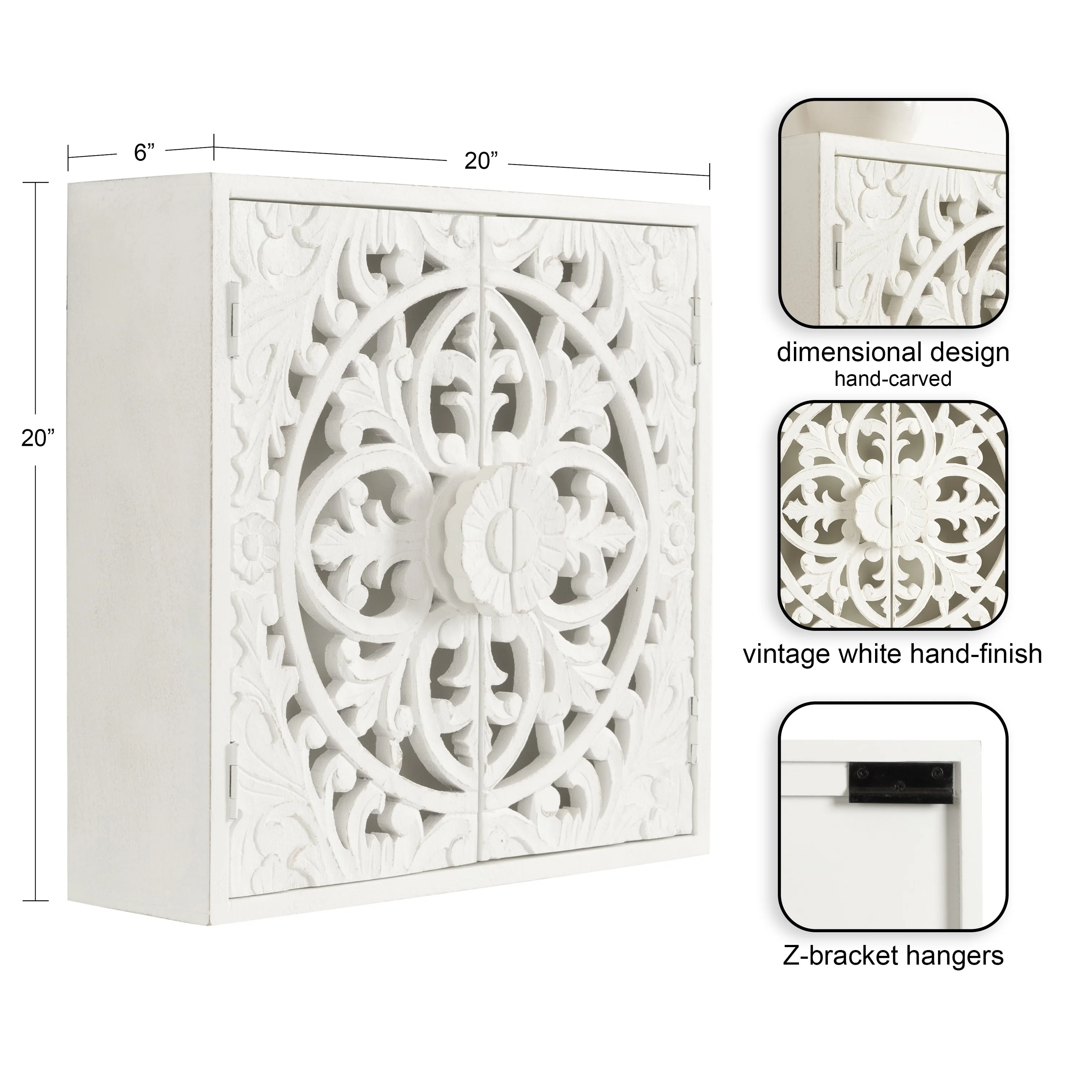 Elevate your bathroom decor with the Kate and Laurel Saanvi carved wall cabinet. Craftsmanship meets elegance in the intricate wood carving that graces this cabinet. It's not just storage; it's a statement piece, adding sophistication to your bathroom, living room, or bedroom. Designed to make the most of your space, the dimensional over-the-toilet configuration offers smart storage without compromising style. Measuring 20 inches wide by 6 inches deep by 20 inches high, this display cabinet provides ample space for your essentials, from toiletries to hand towels. Built to last, the cabinet boasts a durable construction from solid mango wood, ensuring stability and longevity. Hand-carved by talented artisans in India, this wall cabinet is truly one-of-a-kind with slight variances from product to product. The classic white finish not only complements any decor but also imparts a clean and bright feel to your bathroom. Beyond practicality, the Saanvi wall cabinet serves as a display area. Showcase your favorite decor items on its top surface, adding a personal touch to your bathroom. Or, feature two of them side-by-side under your television for a unique, charming entertainment center. Transform your space into a stylish and organized haven with this exceptional storage and display solution. Use the attached Z-brackets for simple, secure wall hanging.