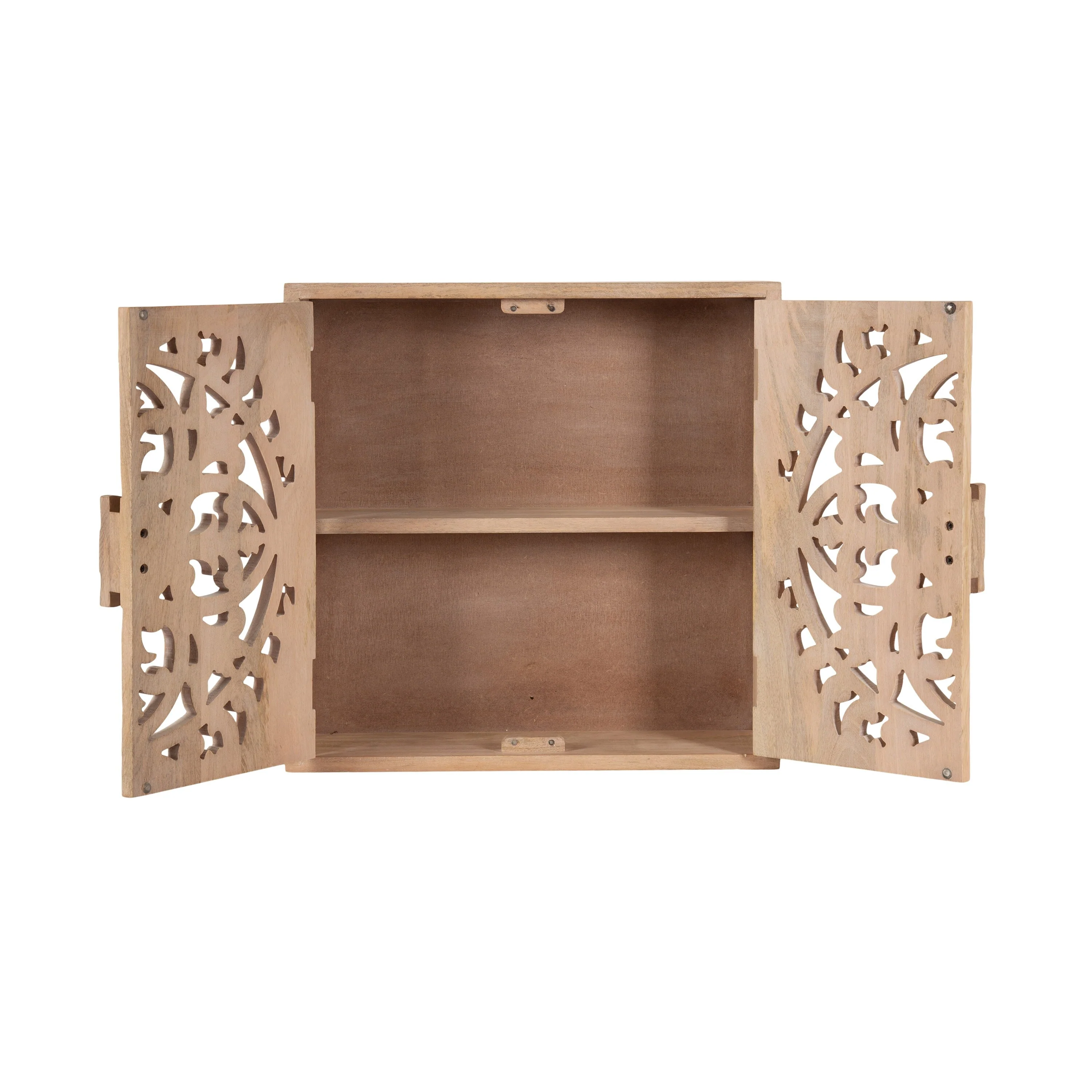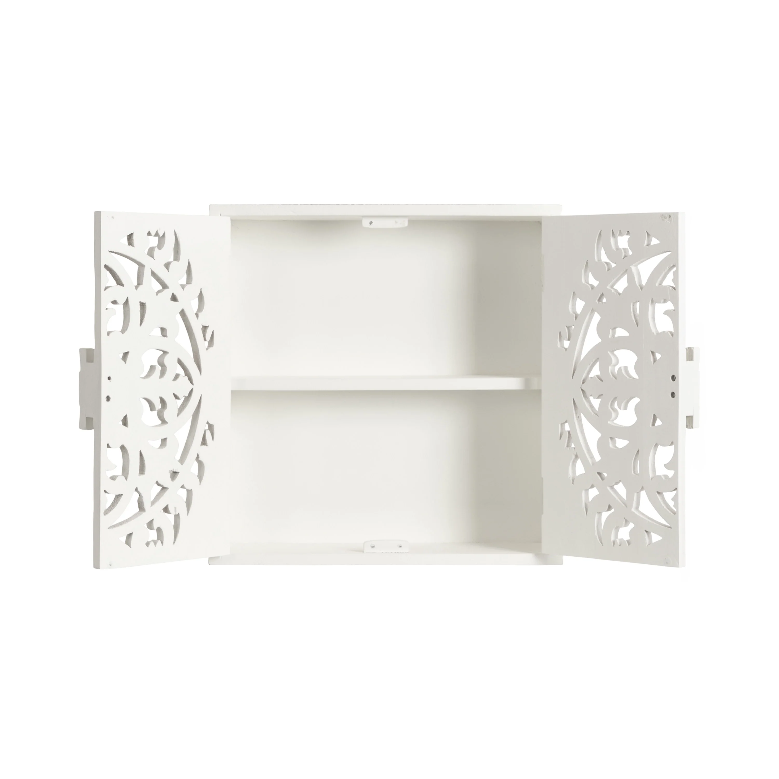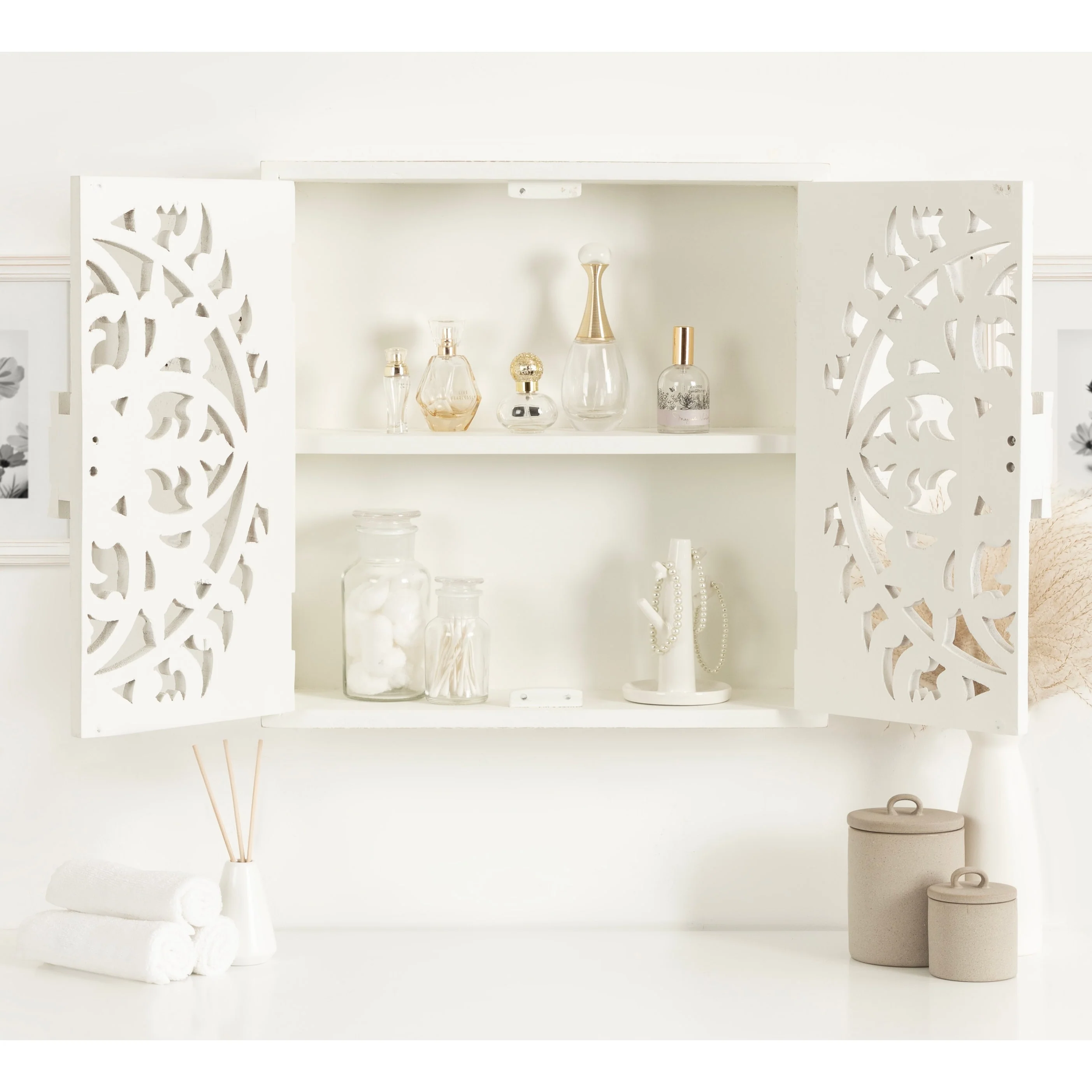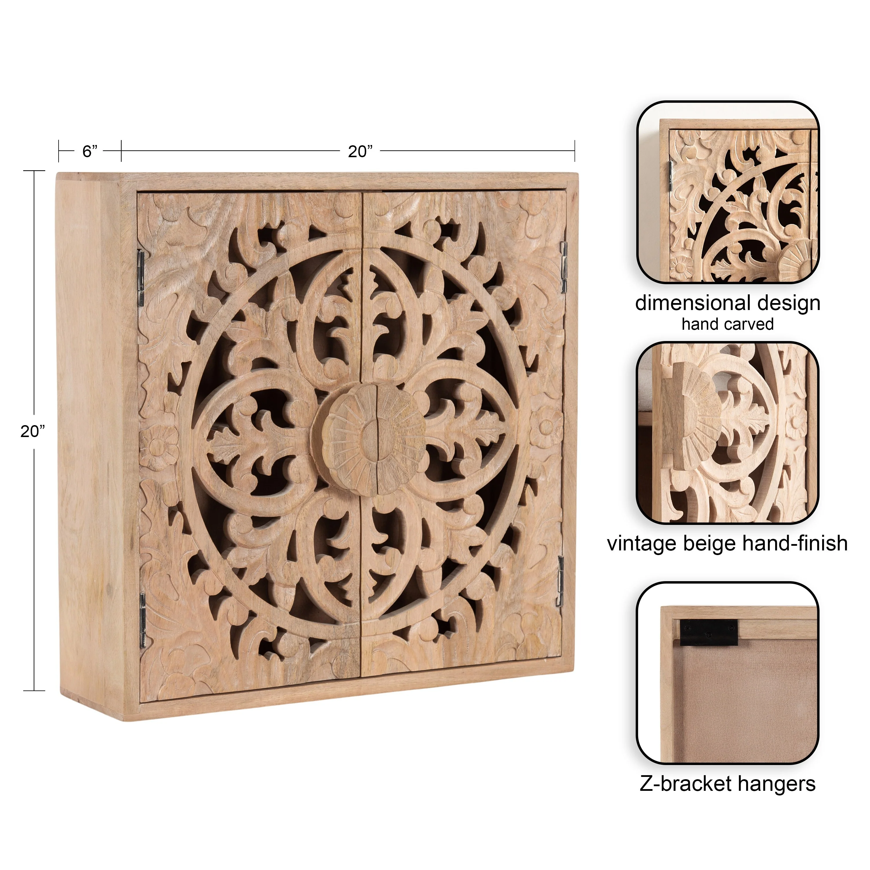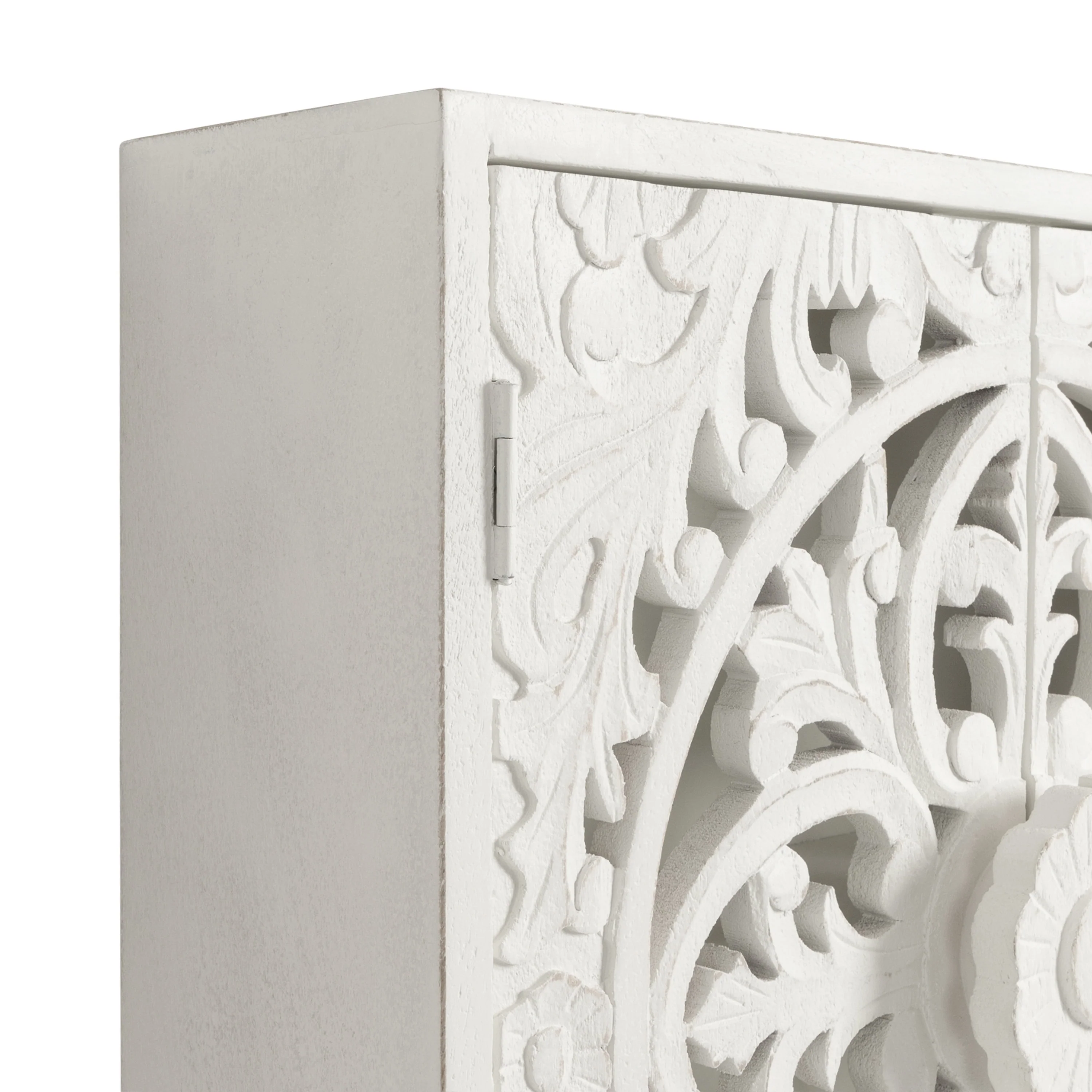 Elevate your bathroom decor with the Kate and Laurel Saanvi carved wall cabinet. Craftsmanship meets elegance in the intricate wood carving that graces this cabinet. It's not just storage; it's a statement piece, adding sophistication to your bathroom, living room, or bedroom. Designed to make the most of your space, the dimensional over-the-toilet configuration offers smart storage without compromising style. Measuring 20 inches wide by 6 inches deep by 20 inches high, this display cabinet provides ample space for your essentials, from toiletries to hand towels. Built to last, the cabinet boasts a durable construction from solid mango wood, ensuring stability and longevity. Hand-carved by talented artisans in India, this wall cabinet is truly one-of-a-kind with slight variances from product to product. The classic white finish not only complements any decor but also imparts a clean and bright feel to your bathroom. Beyond practicality, the Saanvi wall cabinet serves as a display area. Showcase your favorite decor items on its top surface, adding a personal touch to your bathroom. Or, feature two of them side-by-side under your television for a unique, charming entertainment center. Transform your space into a stylish and organized haven with this exceptional storage and display solution. Use the attached Z-brackets for simple, secure wall hanging.