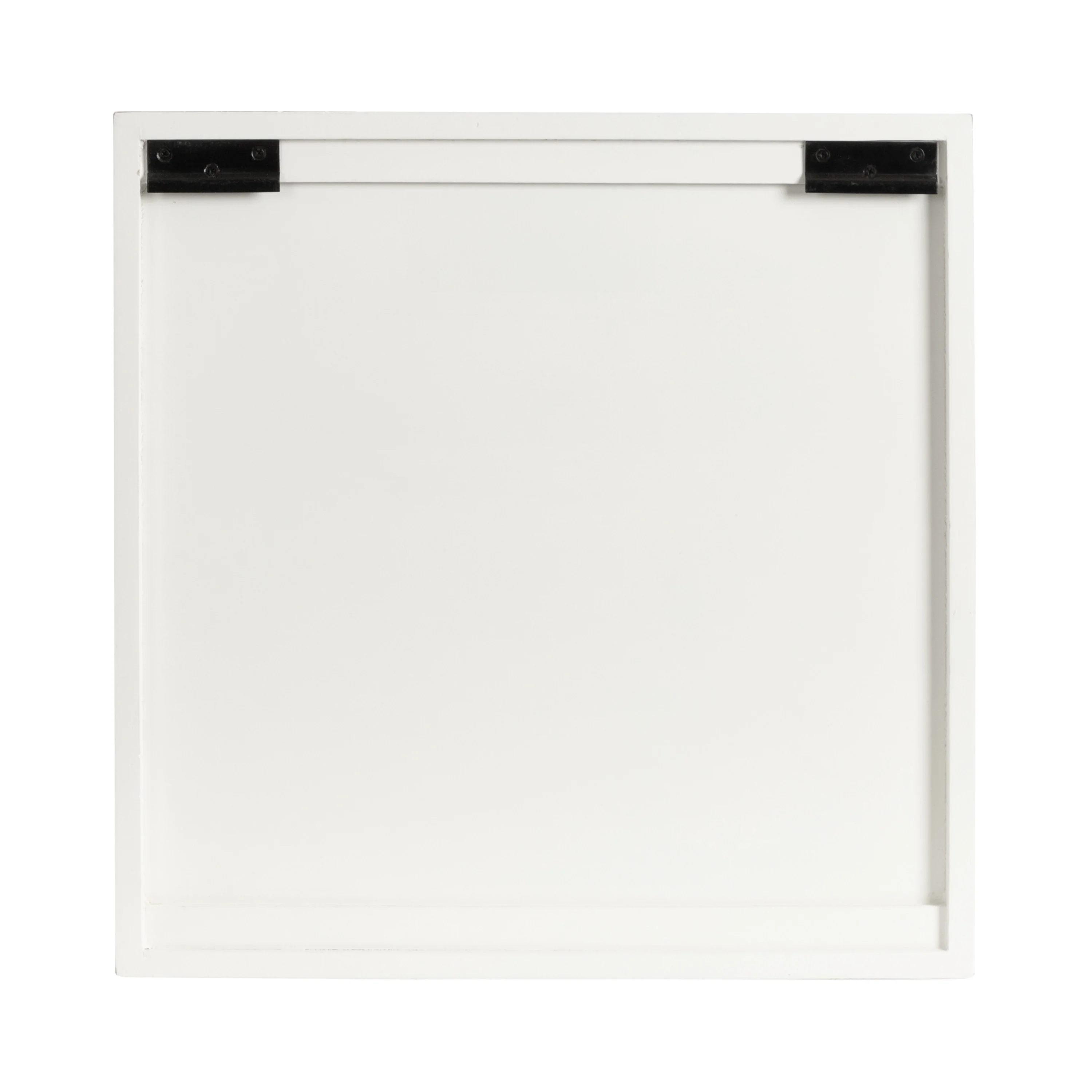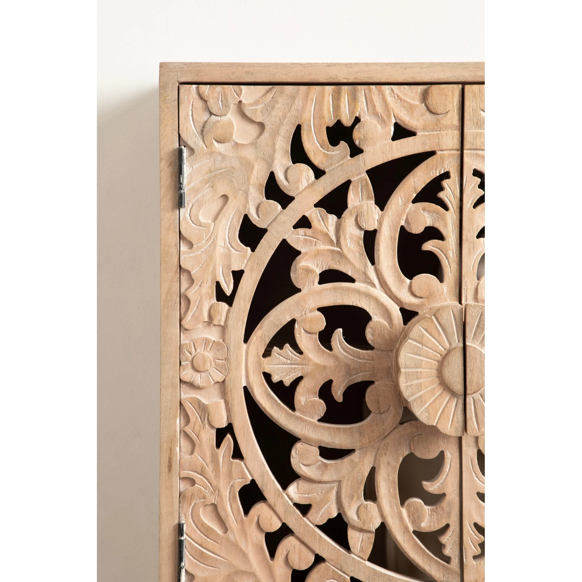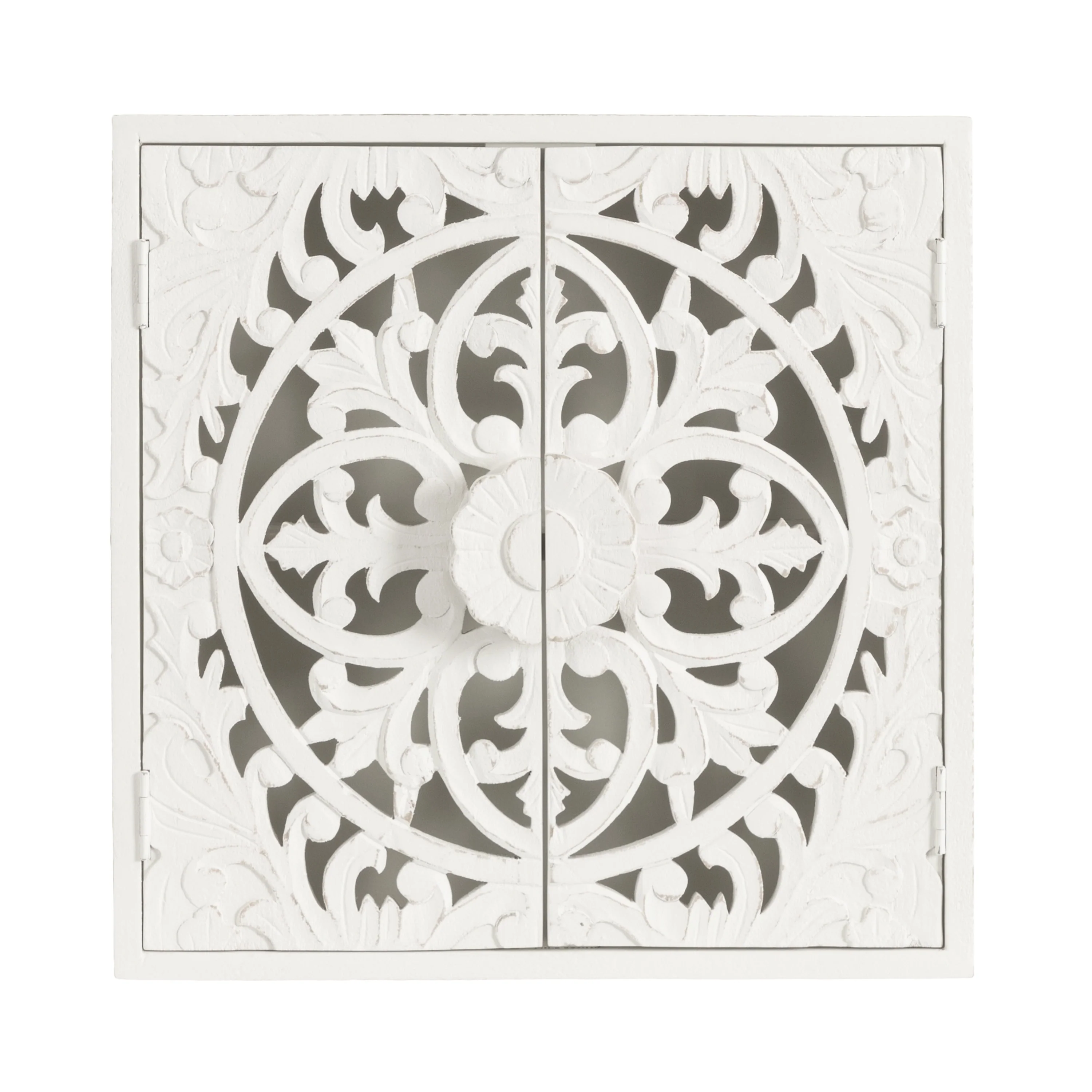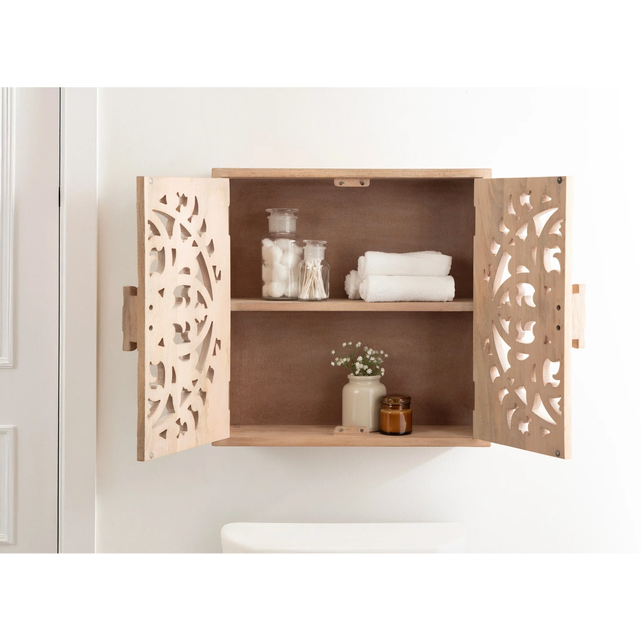 Elevate your bathroom decor with the Kate and Laurel Saanvi carved wall cabinet. Craftsmanship meets elegance in the intricate wood carving that graces this cabinet. It's not just storage; it's a statement piece, adding sophistication to your bathroom, living room, or bedroom. Designed to make the most of your space, the dimensional over-the-toilet configuration offers smart storage without compromising style. Measuring 20 inches wide by 6 inches deep by 20 inches high, this display cabinet provides ample space for your essentials, from toiletries to hand towels. Built to last, the cabinet boasts a durable construction from solid mango wood, ensuring stability and longevity. Hand-carved by talented artisans in India, this wall cabinet is truly one-of-a-kind with slight variances from product to product. The classic white finish not only complements any decor but also imparts a clean and bright feel to your bathroom. Beyond practicality, the Saanvi wall cabinet serves as a display area. Showcase your favorite decor items on its top surface, adding a personal touch to your bathroom. Or, feature two of them side-by-side under your television for a unique, charming entertainment center. Transform your space into a stylish and organized haven with this exceptional storage and display solution. Use the attached Z-brackets for simple, secure wall hanging.