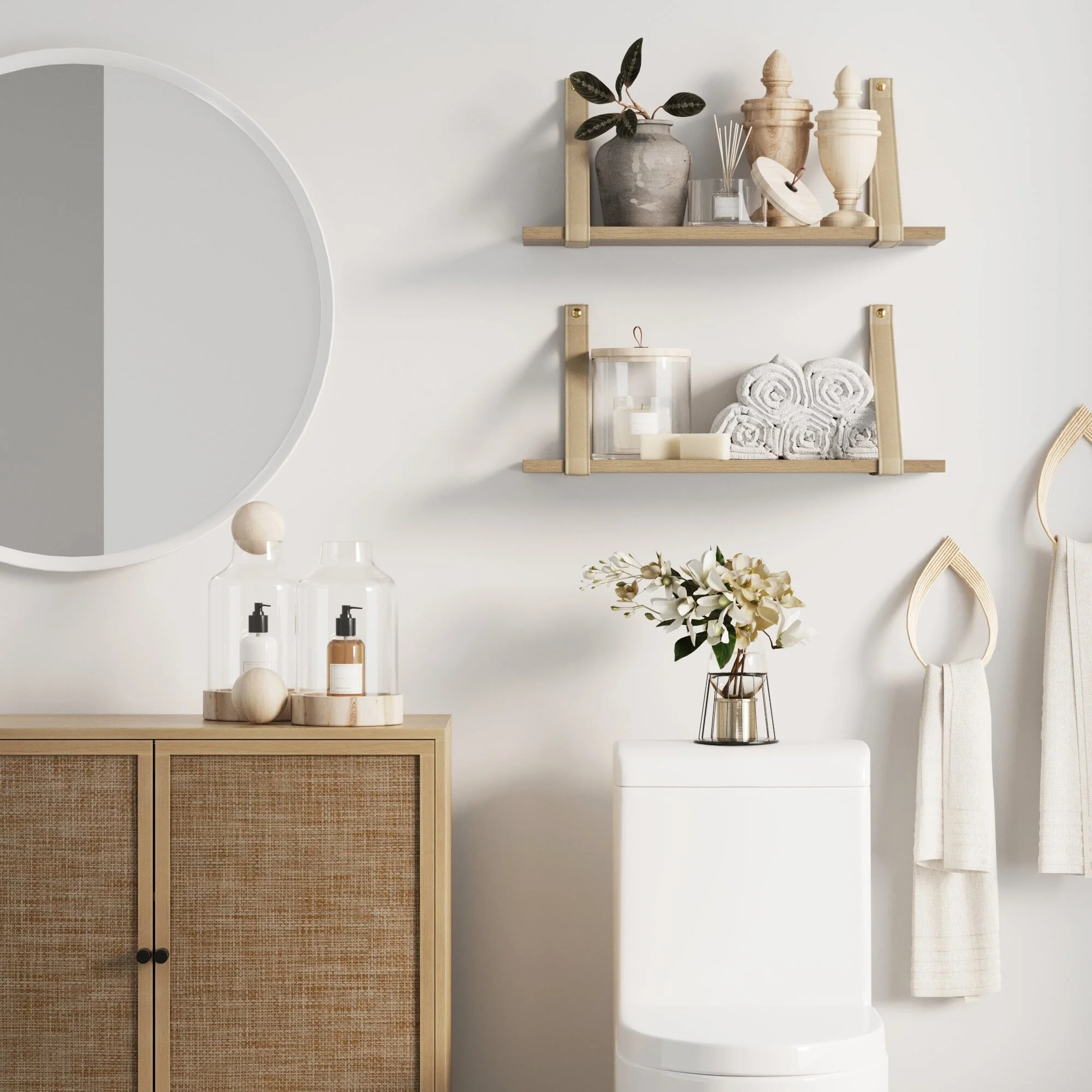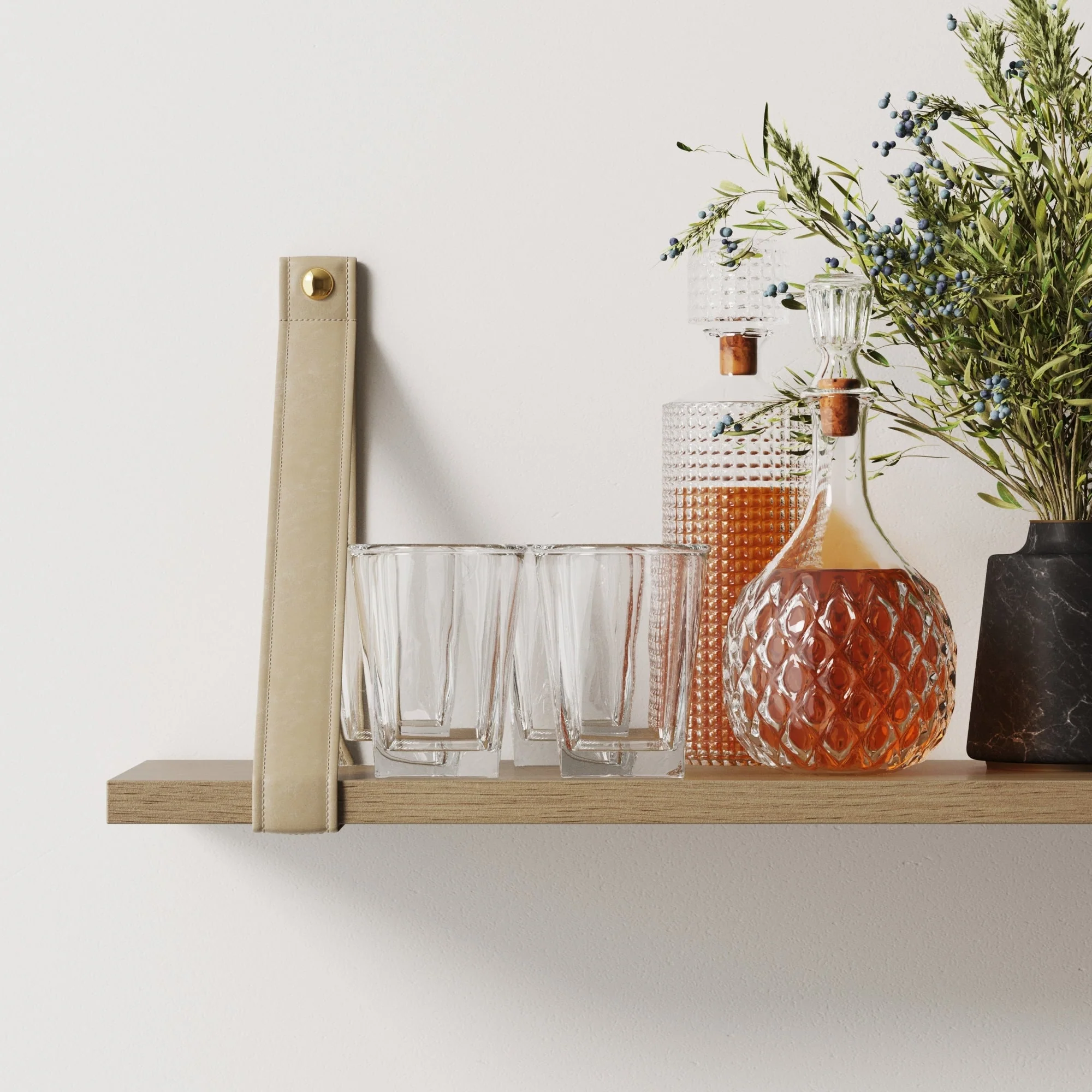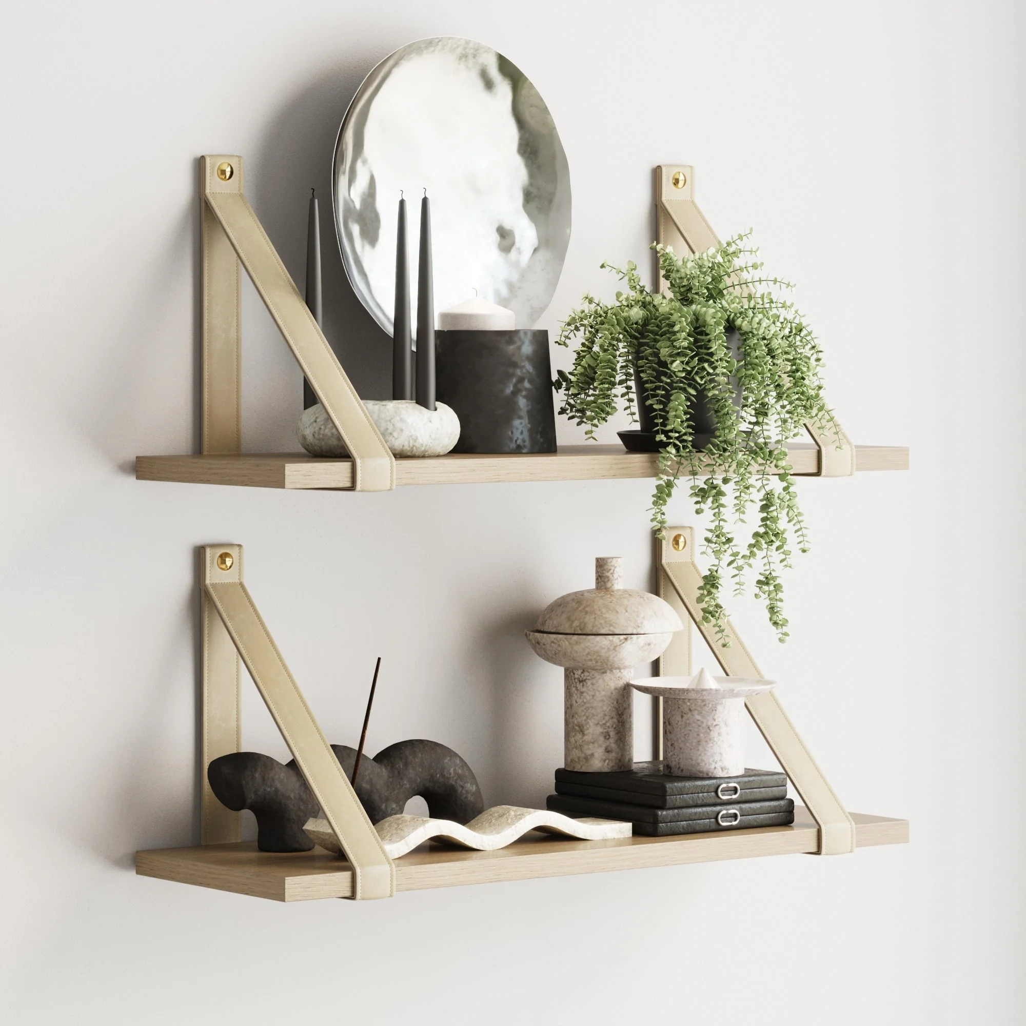 Brandon is a modern minimalist storage floating shelf that will display all of your accessories in style. This wall shelf is the perfect balance of mid-century glam with a touch of bohemian. This set of 2 floating shelves can be stacked to take full advantage of your vertical space or placed side-by-side for the look of one continuous shelf. Durable vegan leather straps hold up the thick MDF shelves that feature a realistic marble laminate. Mounting accessories included featuring beautiful brass hardware ‘caps’ for a seamless elevated design.