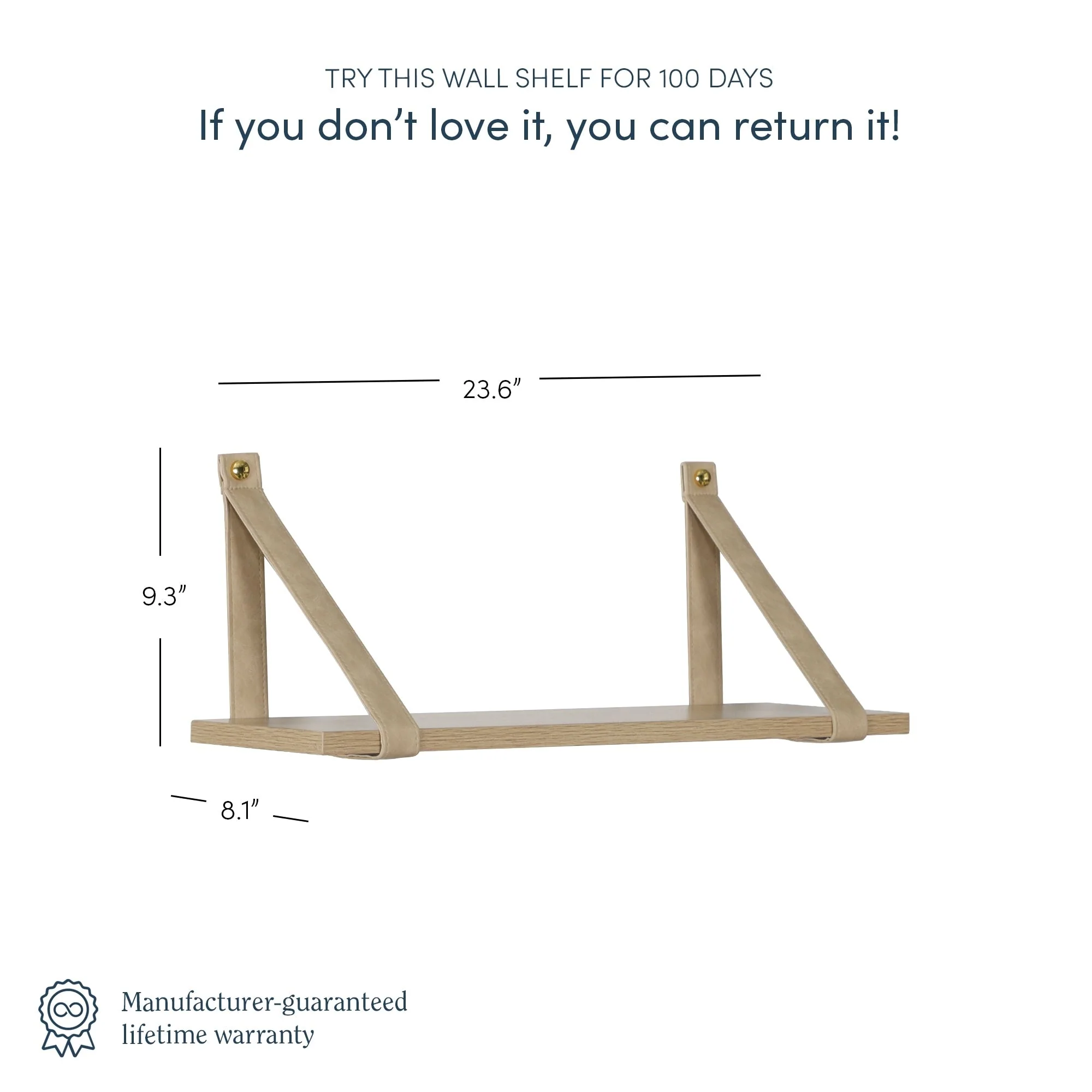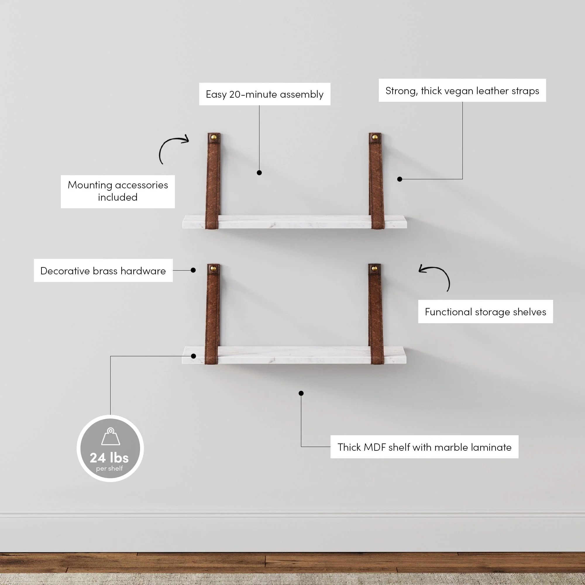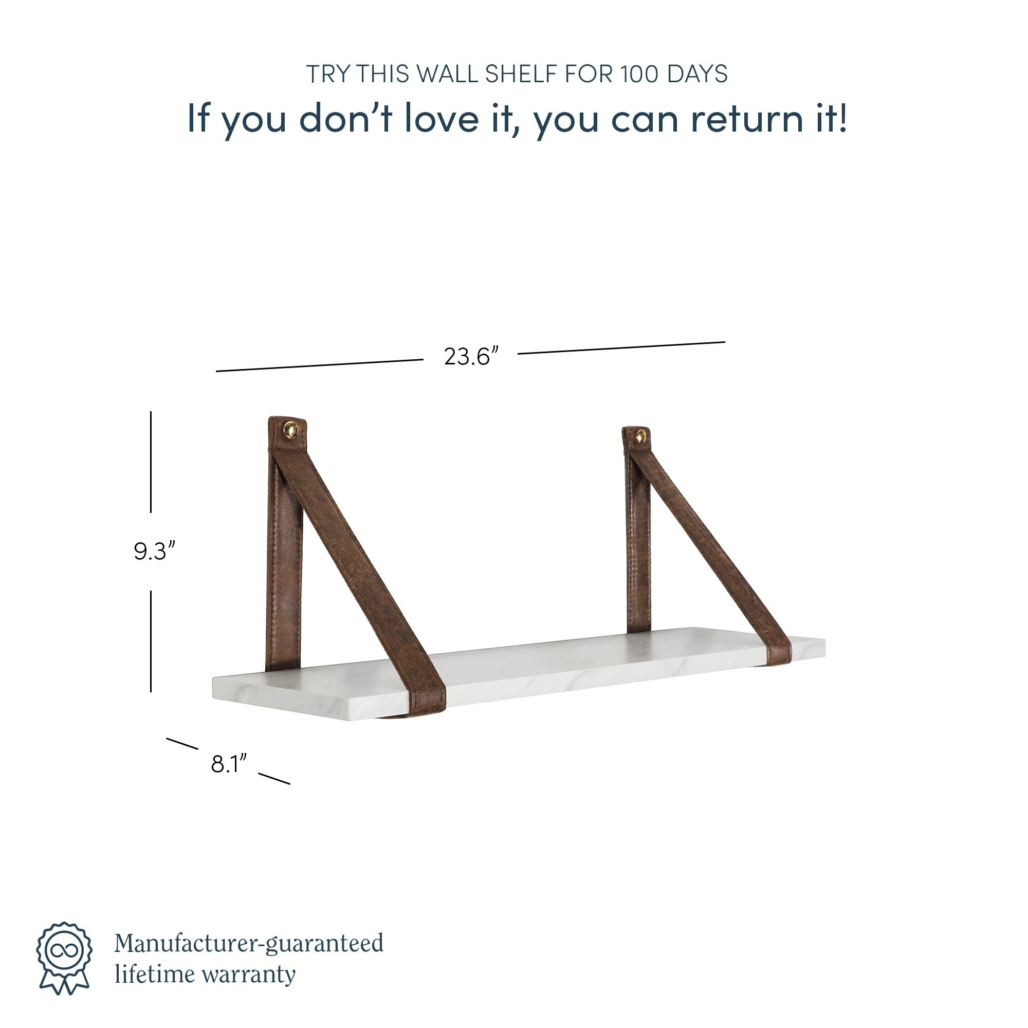 - Brandon features strong thick vegan leather straps to hold the hanging modern shelf for walls. The thick MDF shelf has an option of white marble laminate finish or light oak wood laminate finish to display all of your decors with style.