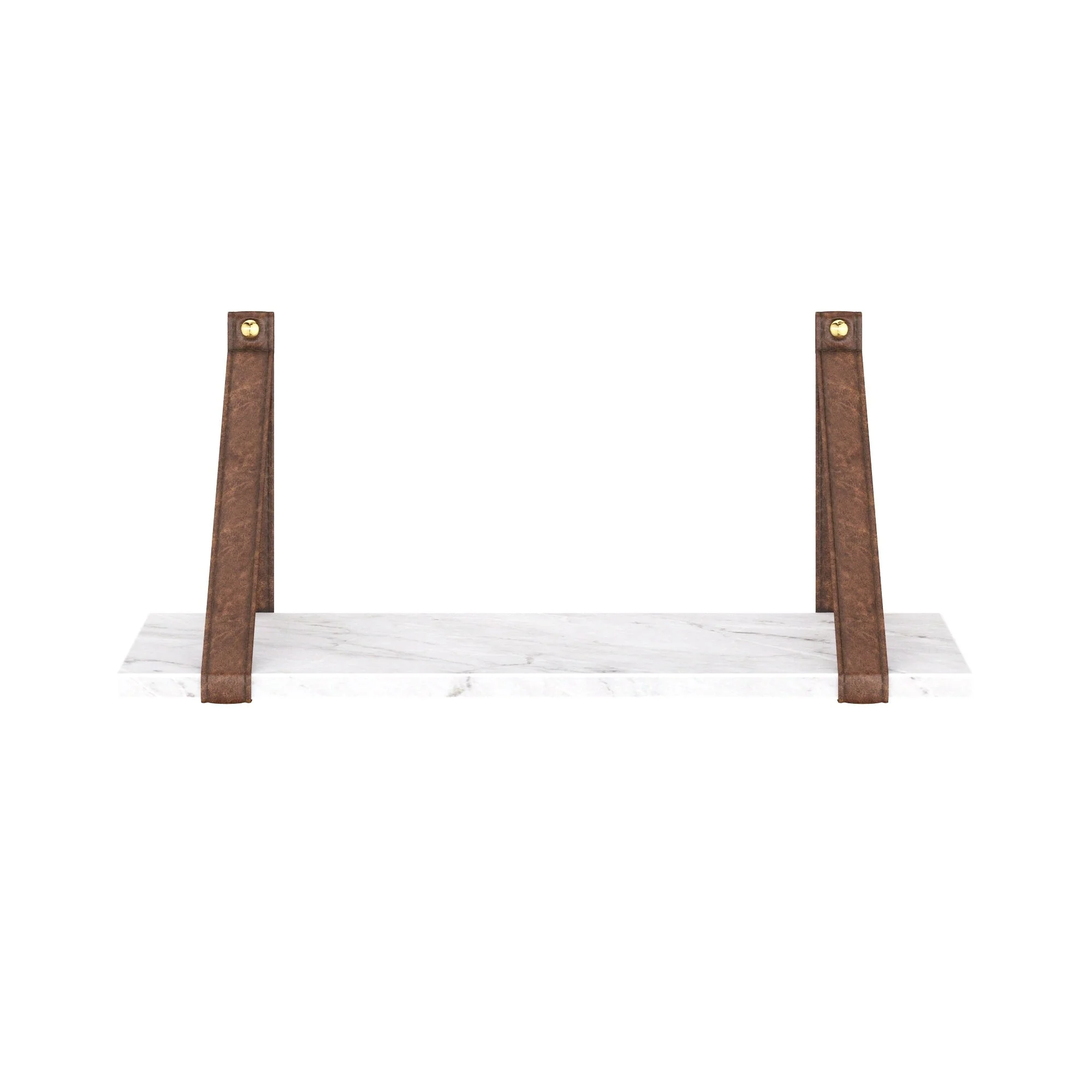 - All mounting accessories are included, featuring decorative brass hardware 'caps' which complement the elegant and airy look of this marble shelf. The durable vegan leather straps hold up to 24lbs.