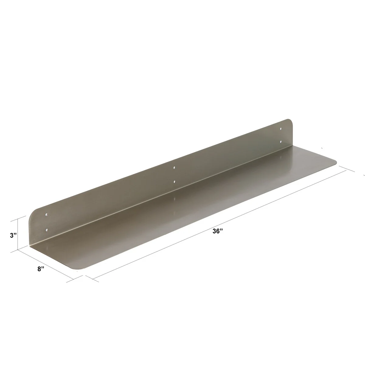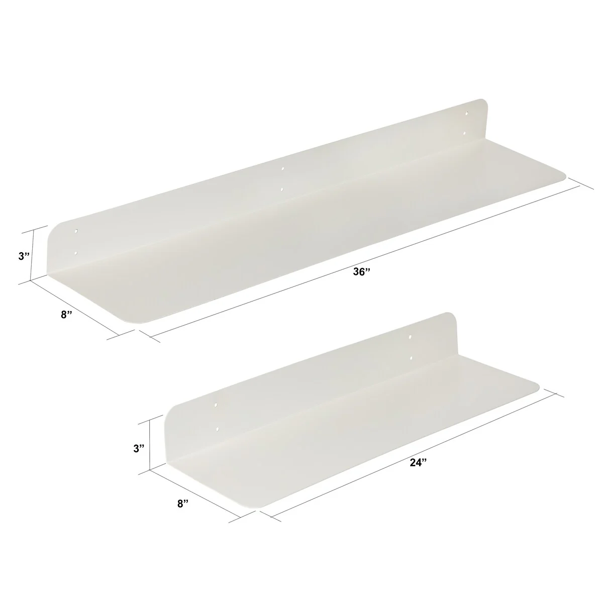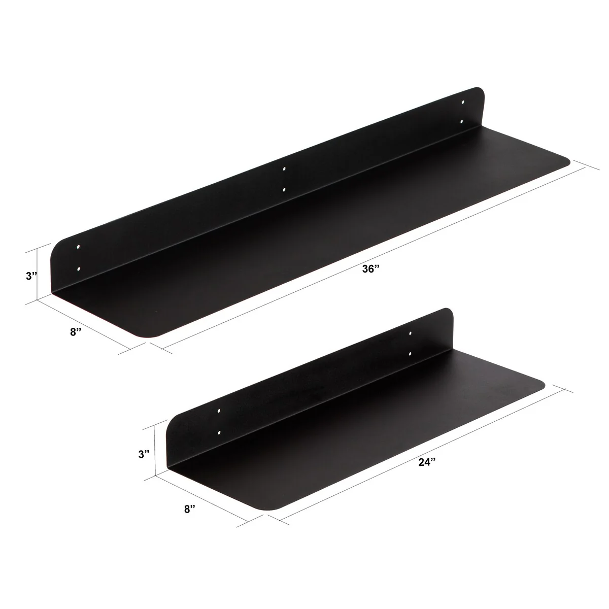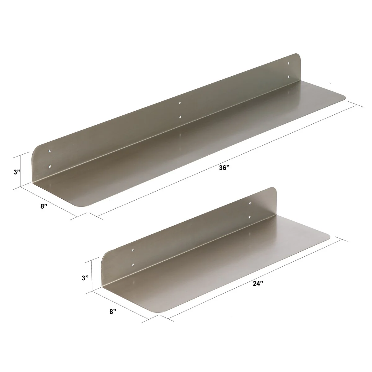 •METAL SHELF: Shelves are made of 1.5 mm thick metal steel with rounded corners. Color Options: These are powder coated in four beautiful colors: Antique Brass, Textured Black, Brushed Nickel, and White. Size Options: Available single in 24x8 inches and 36x8 inches, Set included one 24x8 and one 36x8 inches, and have 3 inches height to protect wall from stains.