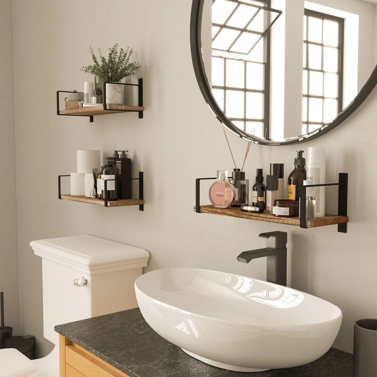 Wallniture Toledo rustic floating shelves for living room will be a perfect addition to your farmhouse decor. Ideal for storing books, DVDs, CDs, these functional and aesthetic wall shelves will beautifully display small indoor plants, picture frames and decorative objects! This chic wall storage solution will help you to utilize dull wall space in any room, while decorating. Utilize as bookshelves in your living room, or as pantry shelves in your kitchen to organize spice jars, canned food and mugs.