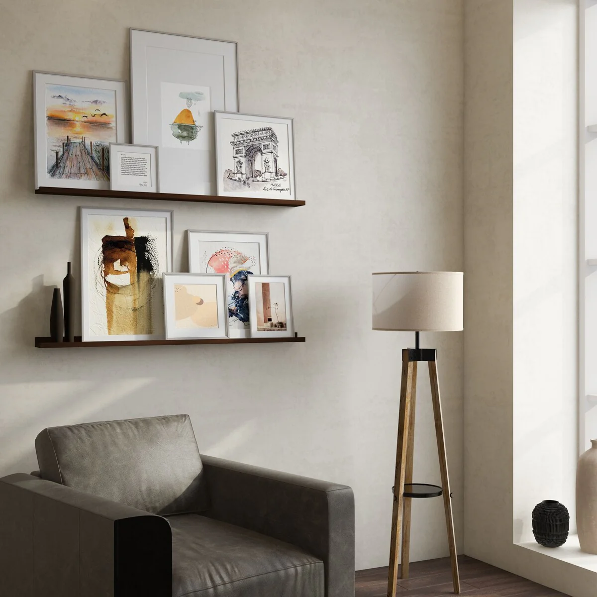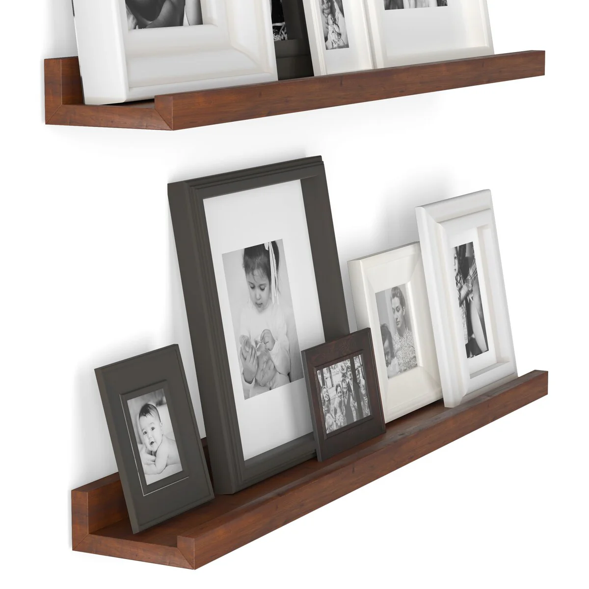 Upgrade your living room decor with the modern and chic design of the Walnut Picture Ledge, Vinyl Display Shelf, and Wood Floating Shelf Set. These stylish floating shelves come in a walnut finish, perfect for displaying your favorite memories, vinyl records, books, collectibles, and more. The front ledges prevent tip-over, making them safe and practical for everyday use.