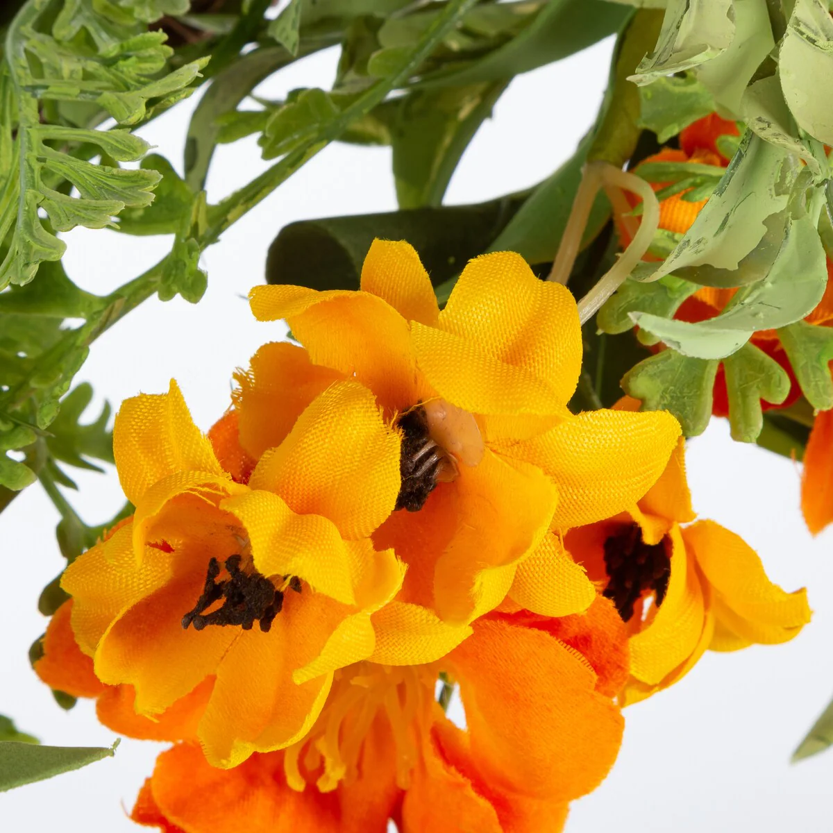 Bring the delight of a blooming garden into your own home with this stunning 24 inch diameter mixed yellow and orange perennial flowers with eucalyptus and ferns wreath. Artfully crafted with orange and rust wildflowers, this beautiful wreath is ideal for year round use. Ideal as a house warming gift for friends, family or that special someone, this stunning wreath is also perfect for accenting your own home.