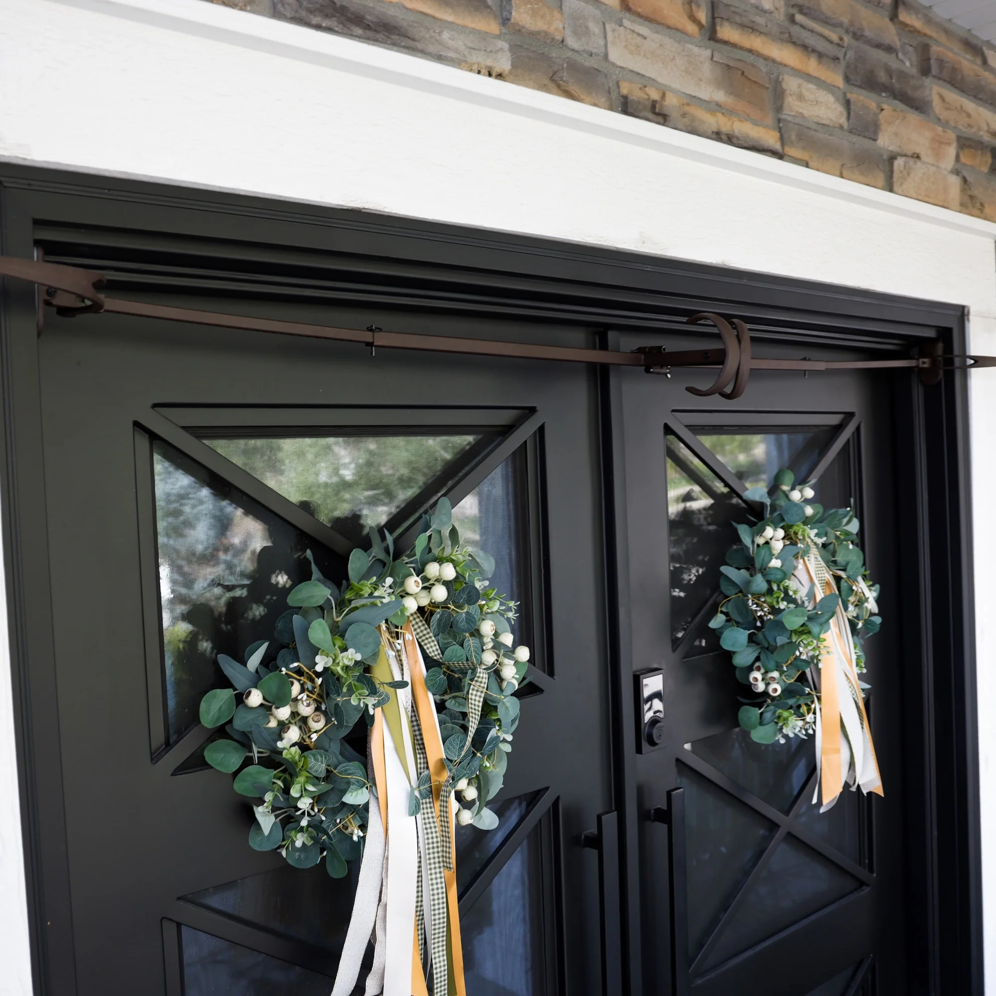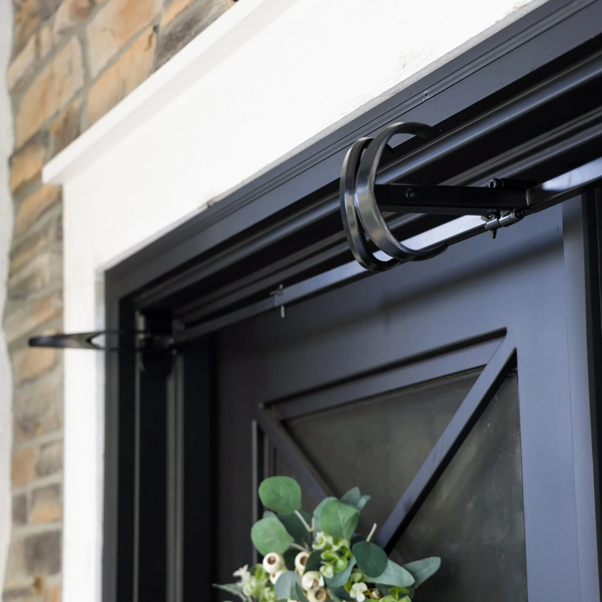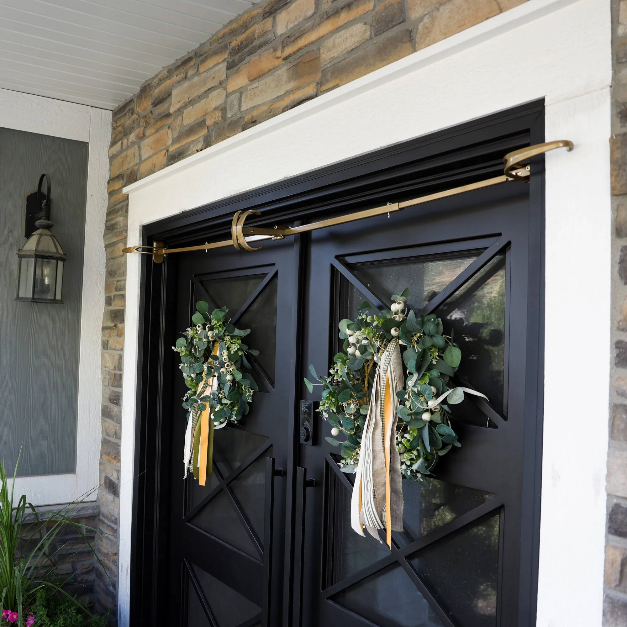 Hanging a garland above your wreath on your double-door front door gives your home the grand entrance you deserve during the holidays, but damaging your home with nails leaves a terrible view for the rest of the year. This patented garland hanger allows you to hang garland around your front door without damaging your home with nails or screws. The hanger's width is adjustable to fit door frames between 52 in. - 82 in. wide. Designed to prevent damage to your door frame, the garland hanger uses pressure to hold garlands up to 20 lbs. up in your door jam. Complete with rubber pads on each end help ensure that your door frame is protected, and a durable powder coating to prevent rusting of the hanger. A Patented Product: Patent(s) 8,777,023 and 9,480,206