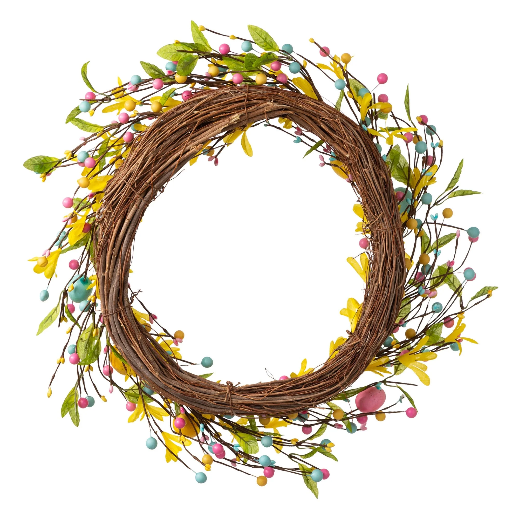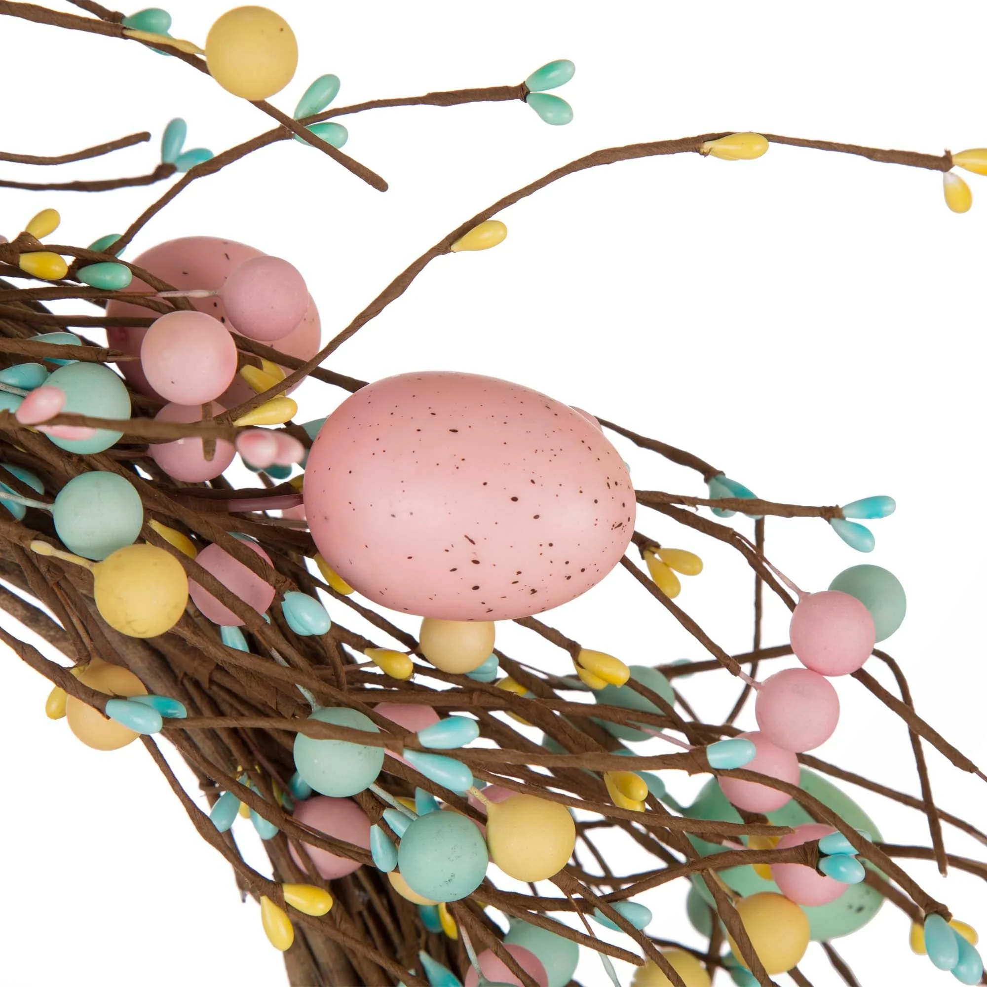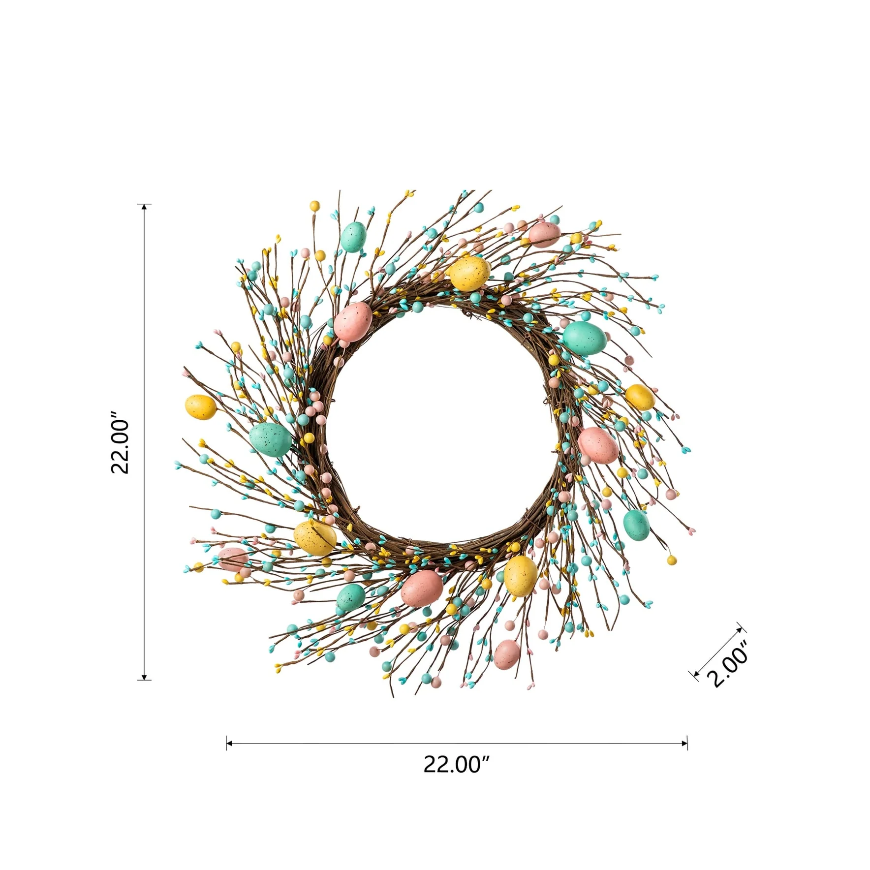 - The wreath includes multi-color berries and easter eggs in different size, mixed types of buds all on a natural twig base.�