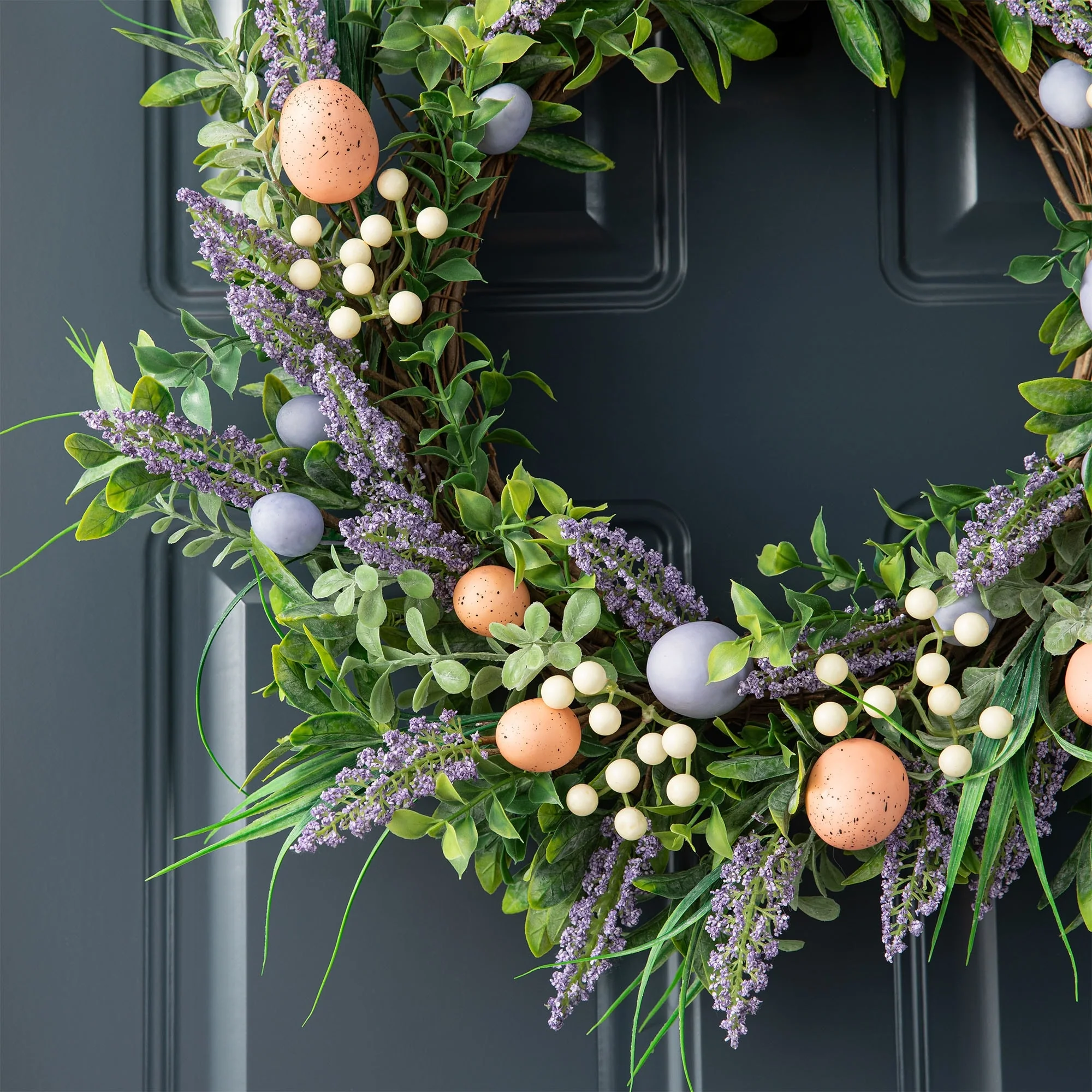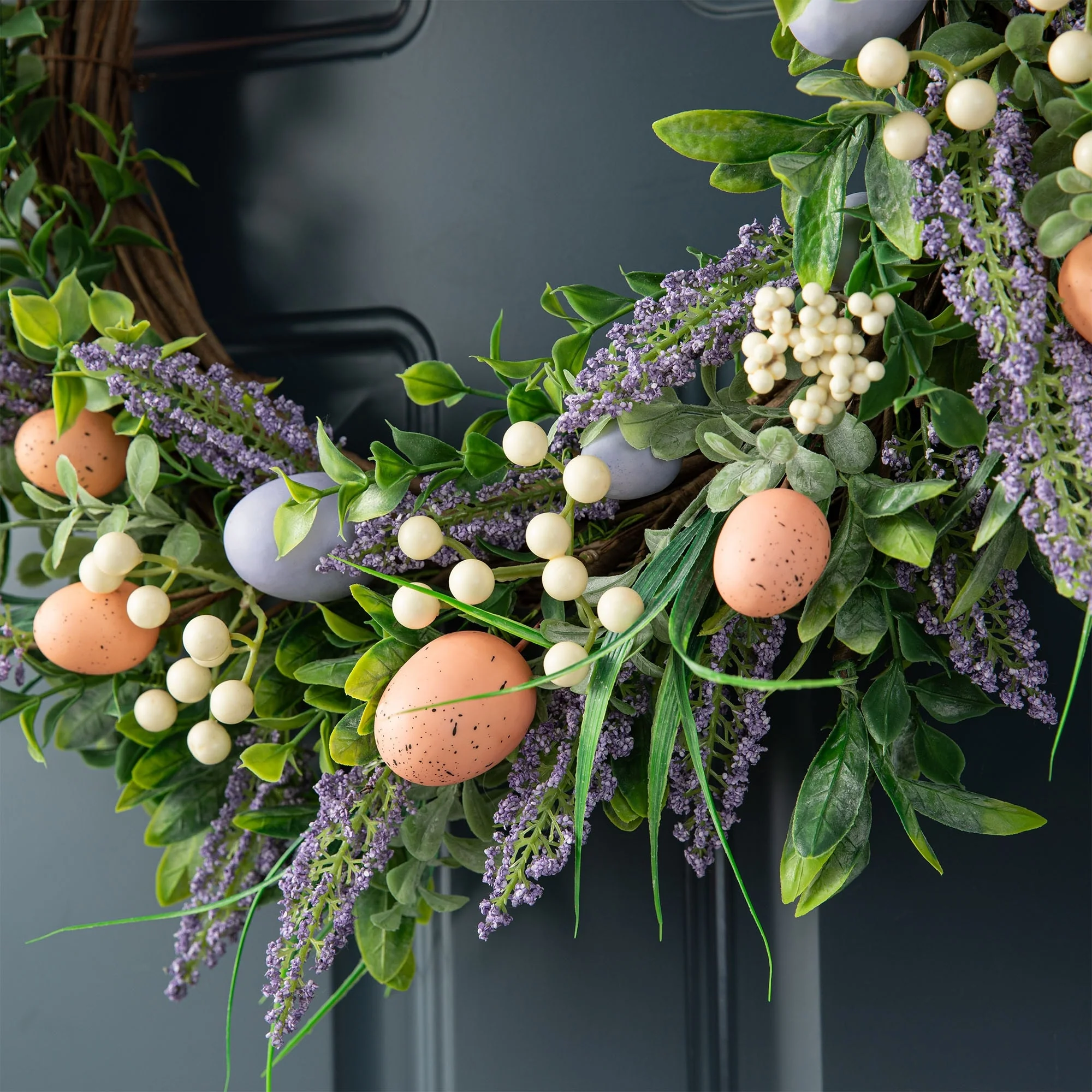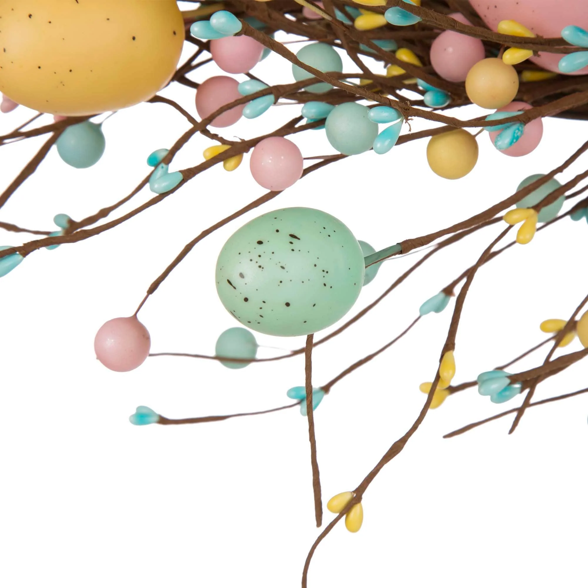 - The wreath includes multi-color berries and easter eggs in different size, mixed types of buds all on a natural twig base.�