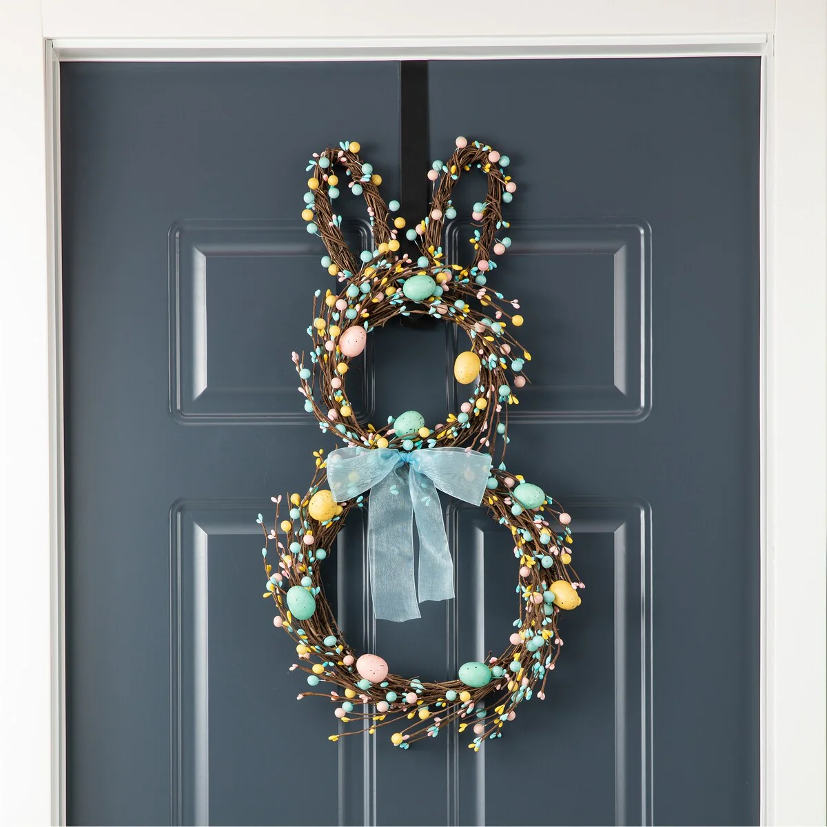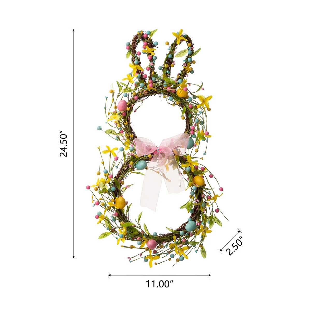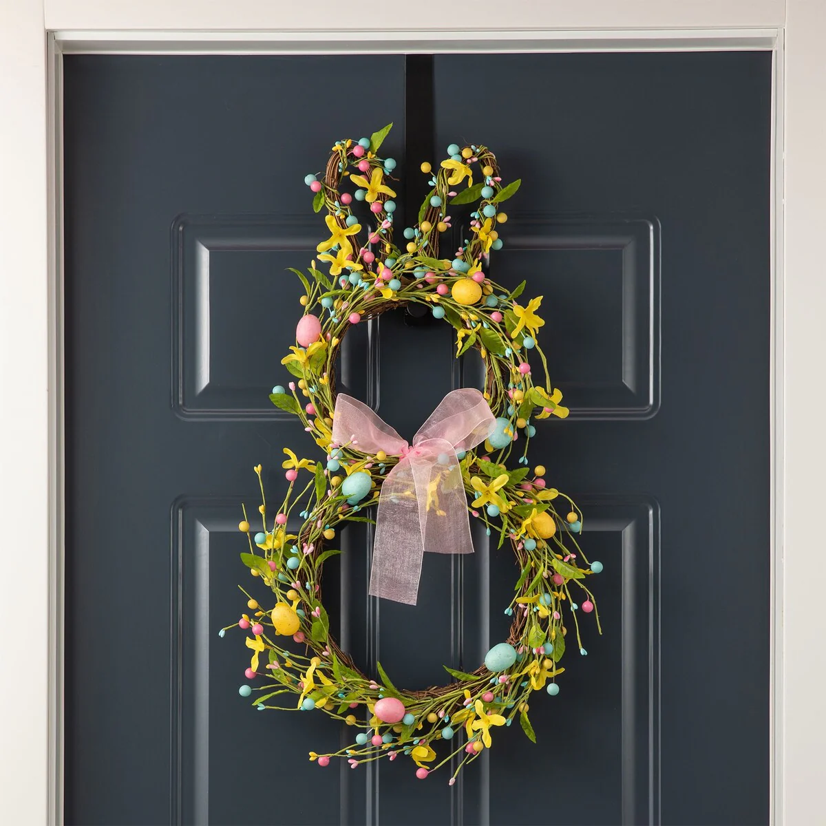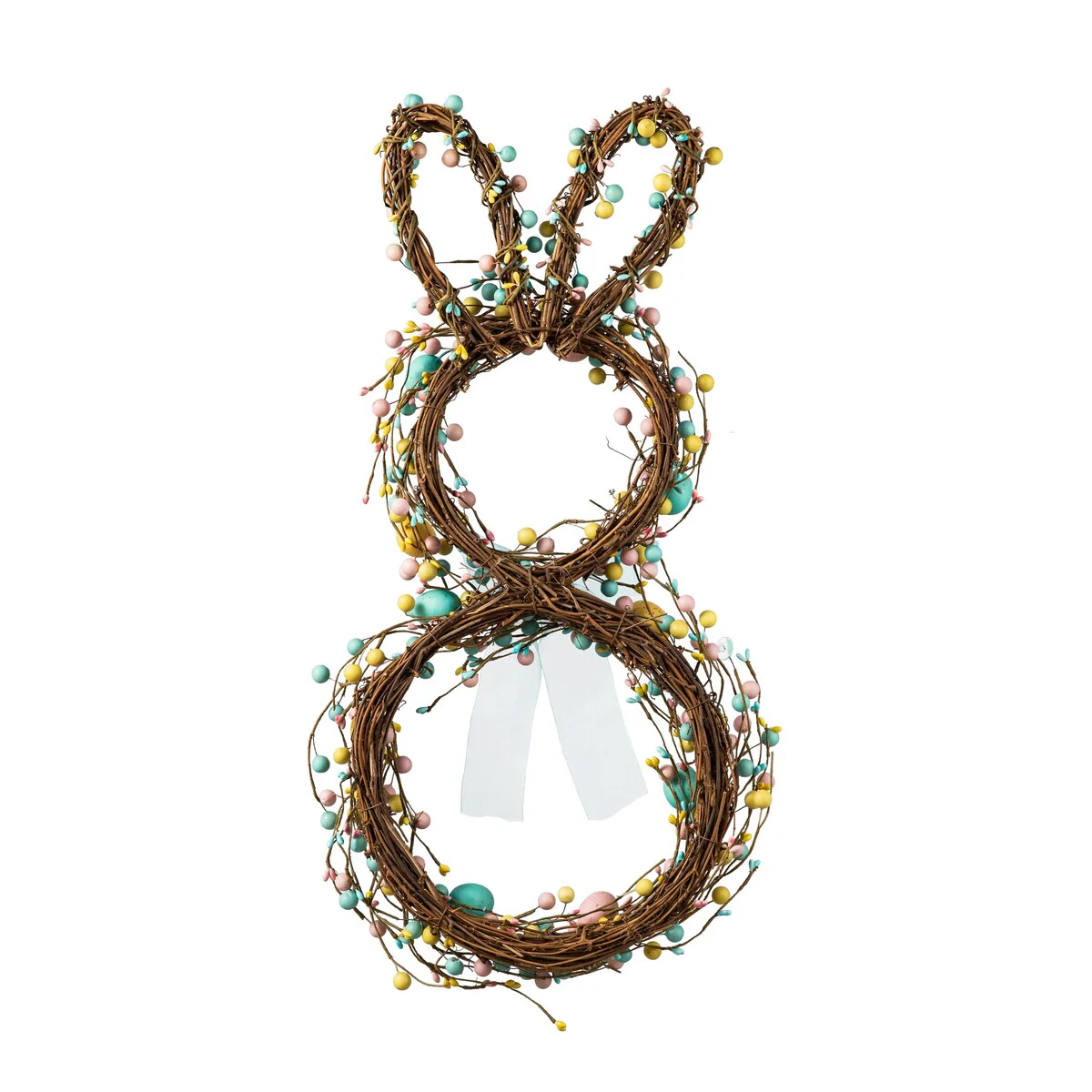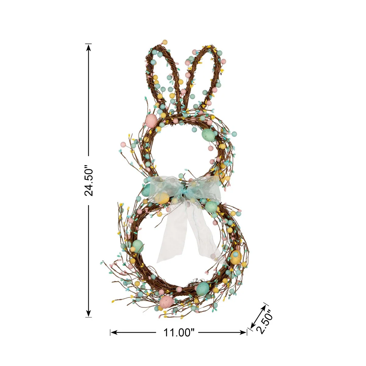 Bring the enchanting smell of the holidays to your home with this Easter bunny-shaped wreath. The wreath features a soft coil of wood vines holding leafy flower blooms and berry clusters all on a woven branch base. Among the flowers and vines are assorted pastel color eggs with a stipple finish. Bunny-shaped wood vines and satin ribbon bow decoration add to a little nifty and cute. �Display this holiday wreath on doors, walls, and windows in indoor or covered outdoor locations.
