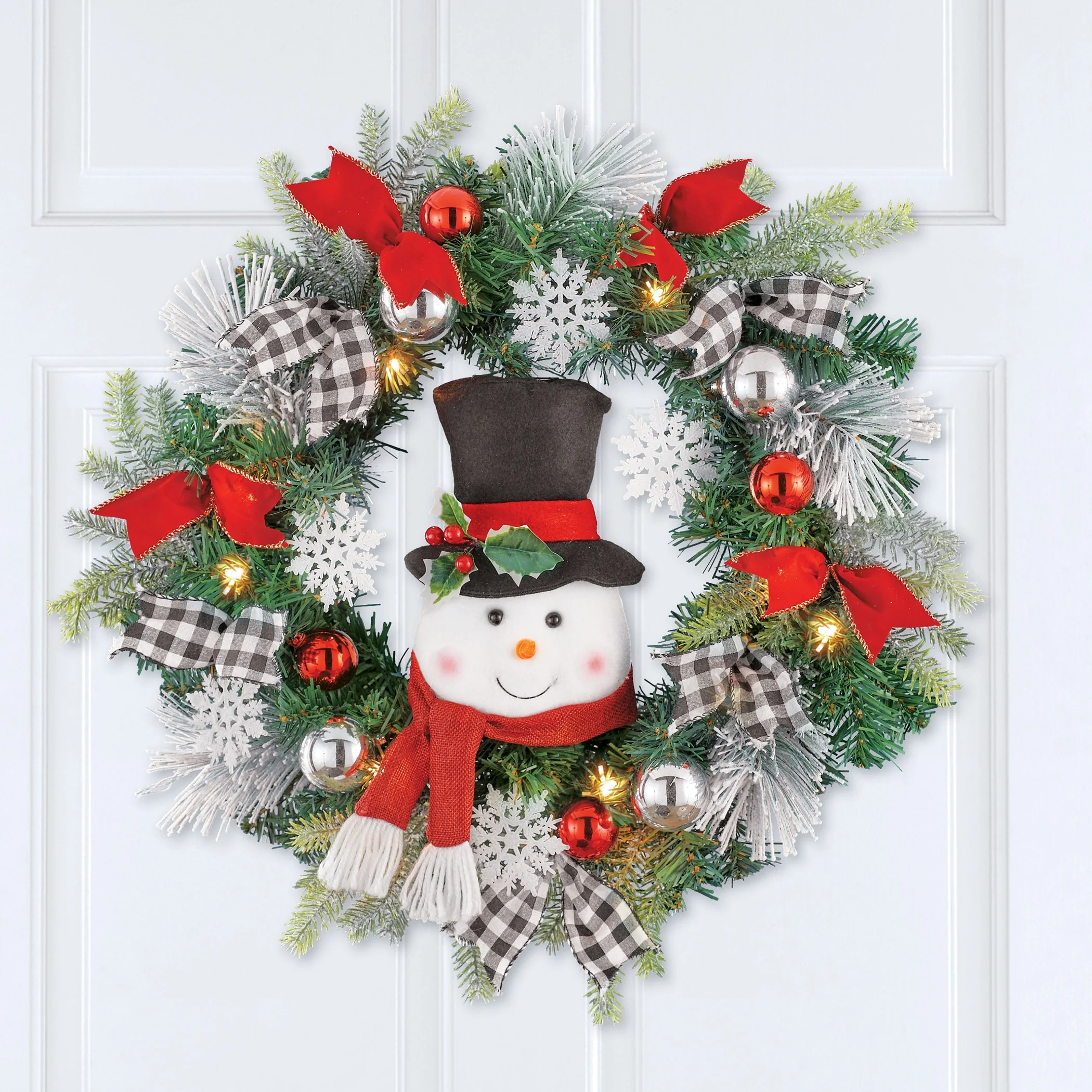 Sparkling ornaments, snowflakes, bows and sparkling LED lights make this festive wreath the perfect addition to your holiday home.The frosted pine base is a great backdrop for the bright and colorful decorations and smiling snowman in the center. Req. 3 'AAA' batteries (sold separately). Hook on the back makes hanging easy. Plastic, polyester and polyfoam. 21'Dia.