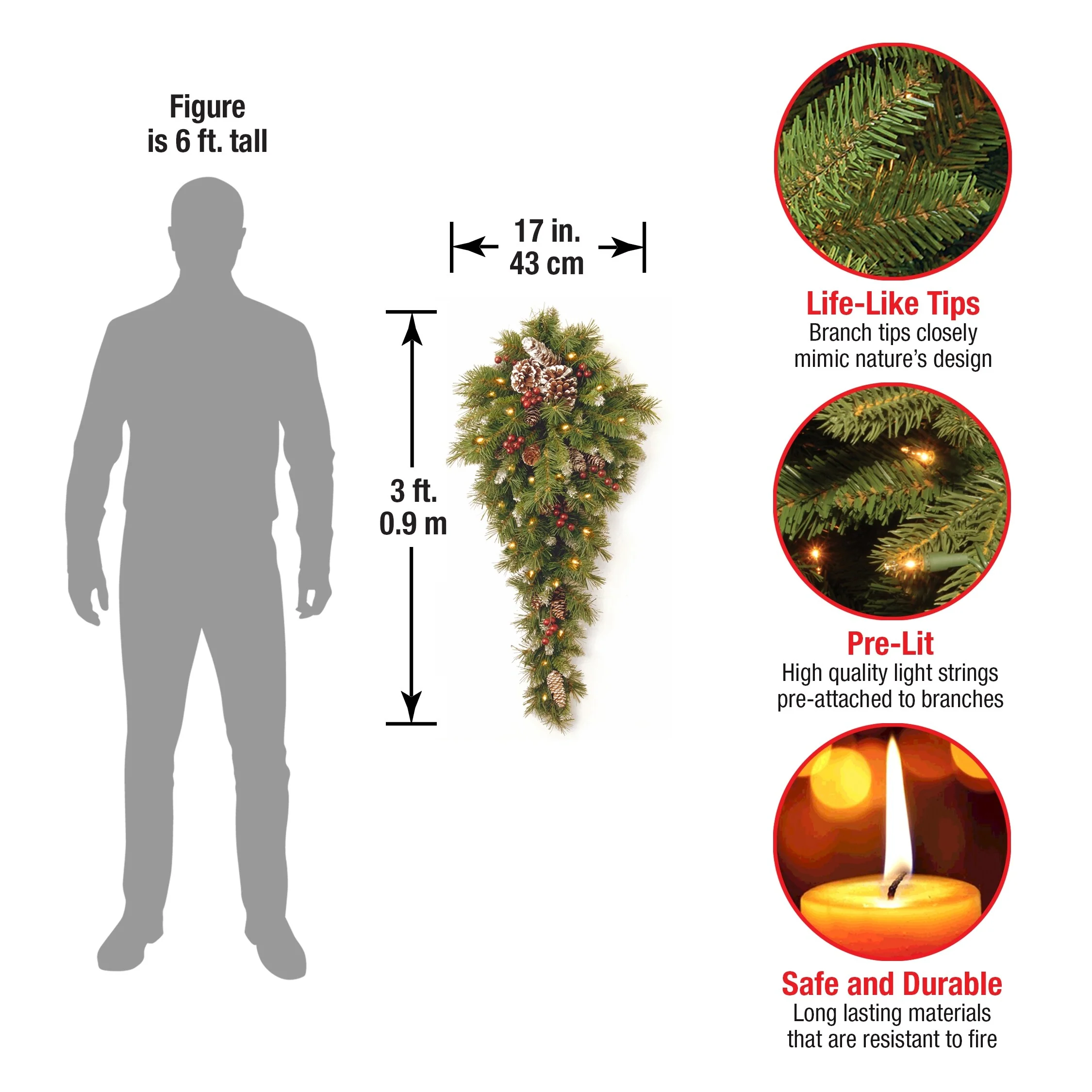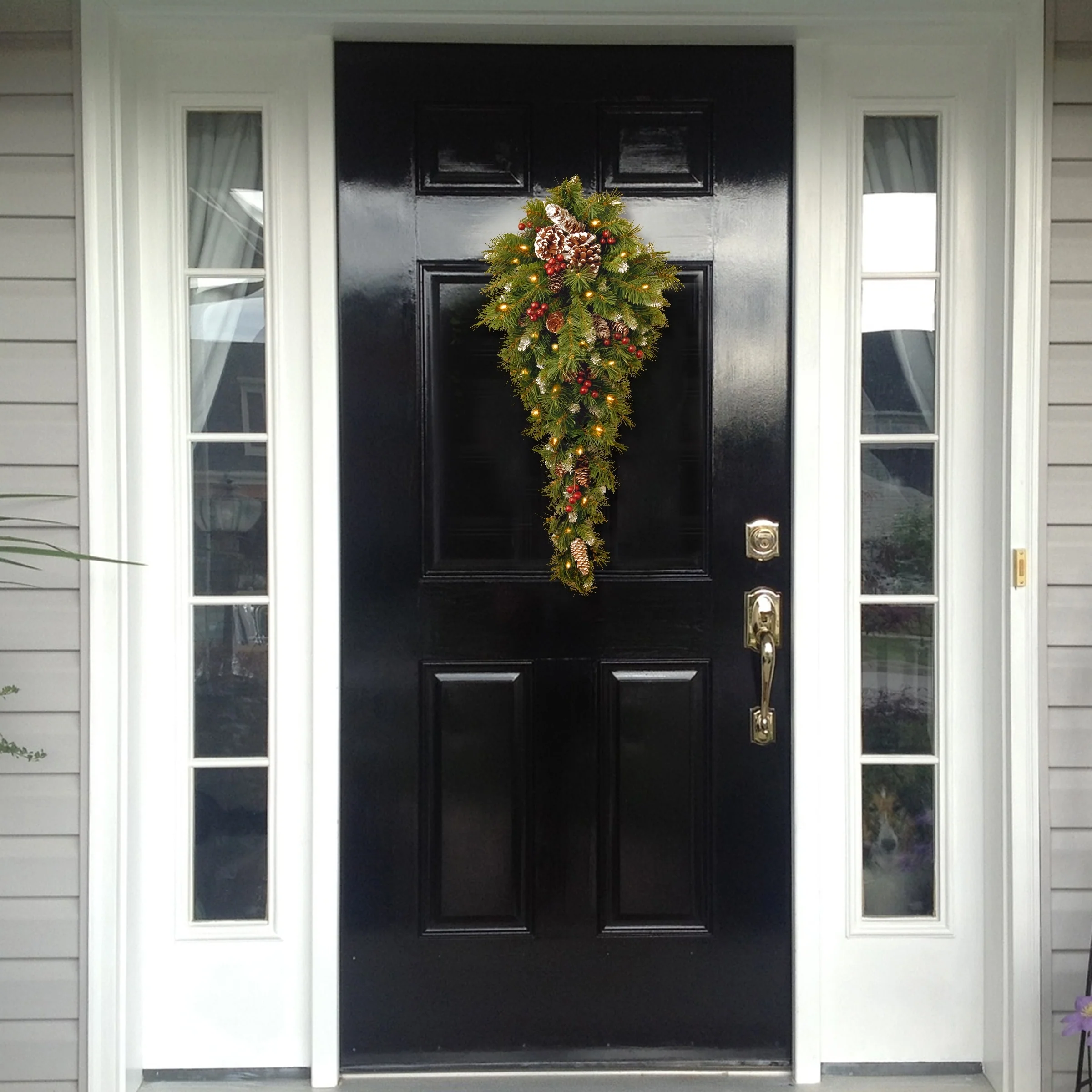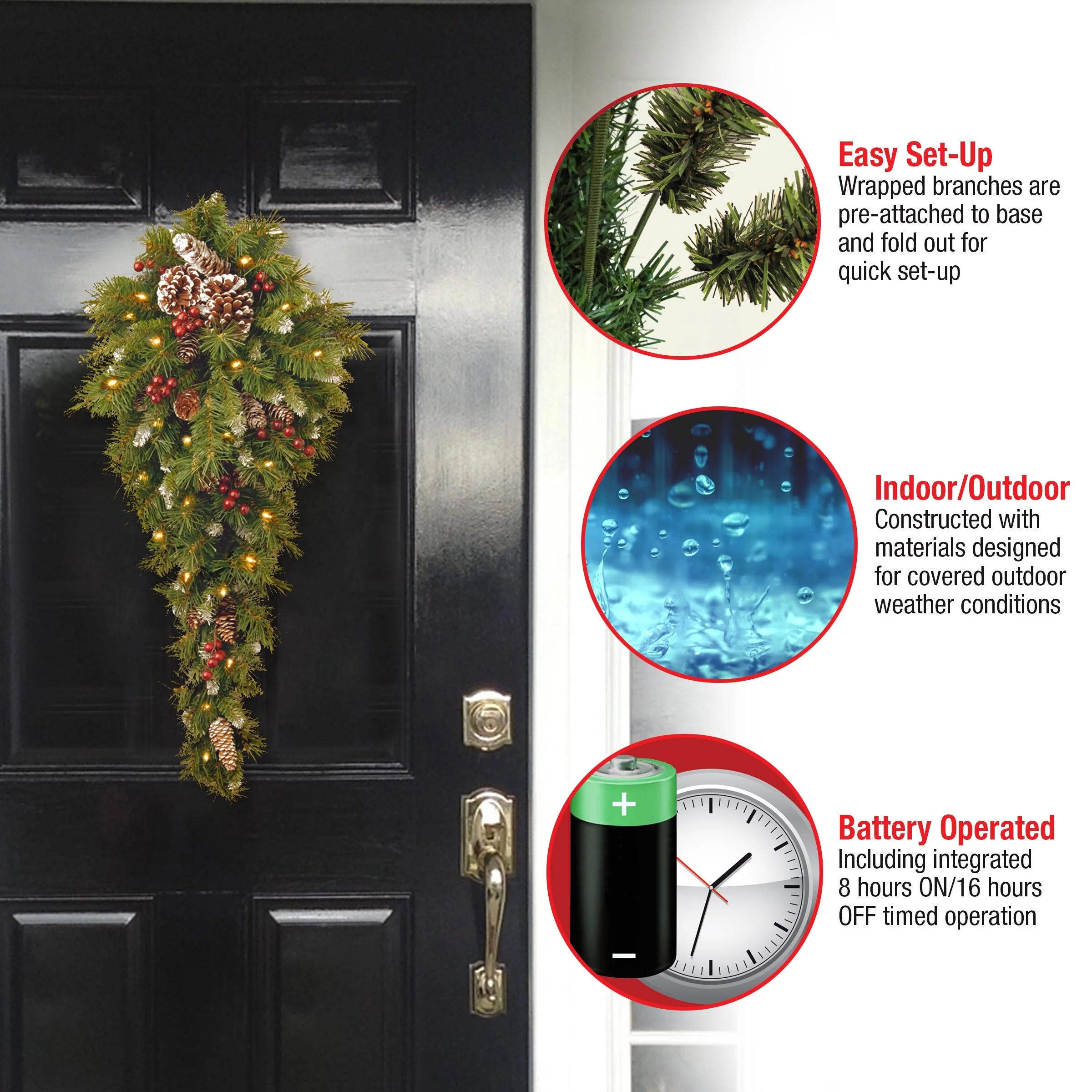 Decorate your home for the holidays in style when you hang this attractive frosted berry teardrop wreath. This festive wreath features battery-operated energy-efficient LED lights, which provide a sparkling look in a covered outdoor location or inside your home.