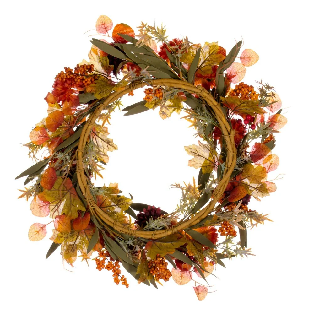 • Vickerman 20 Orange and Burgundy Artificial Mixed Mum, Chinese Lantern, and Berry Wreath.