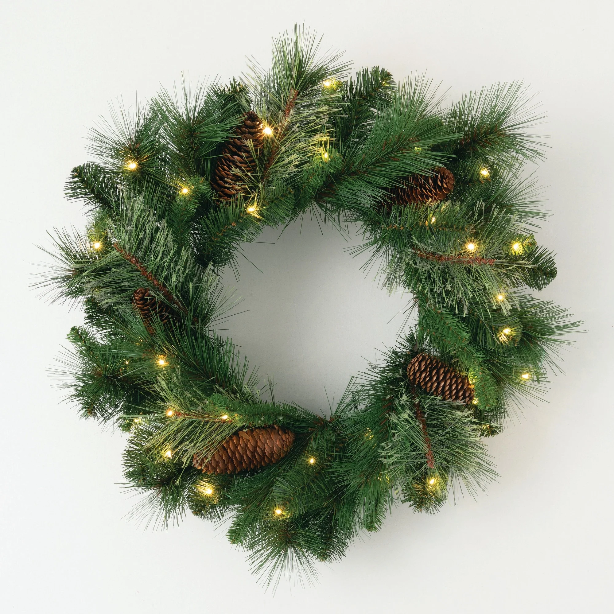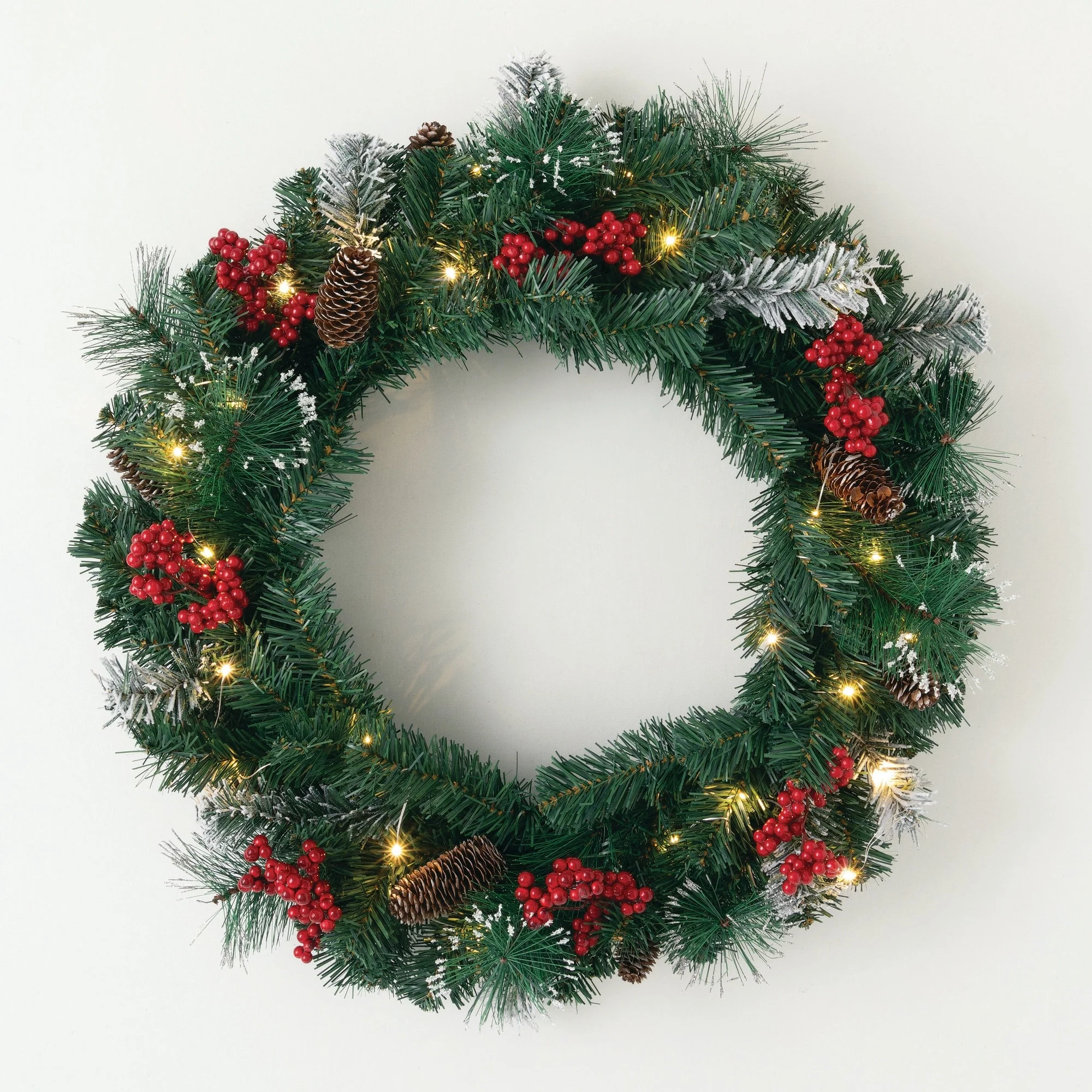 Sullivans Artificial 24 LED Mixed Pine Christmas Wreath with Flocking, Pinecones and Berries, Green