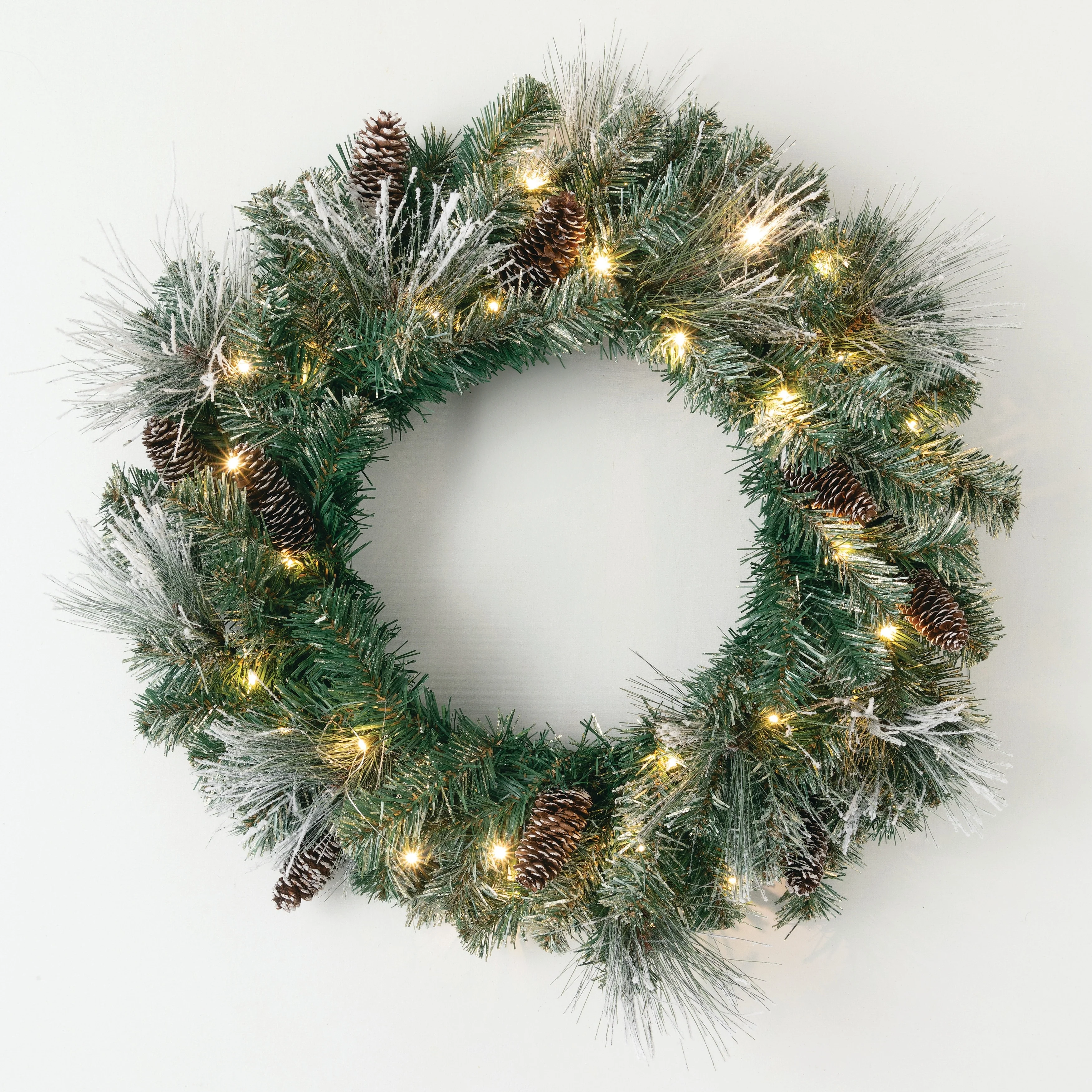 Sullivans Artificial 24 Flocked LED Pine Christmas Wreath with Pinecones, Green, Indoor Christmas Decor