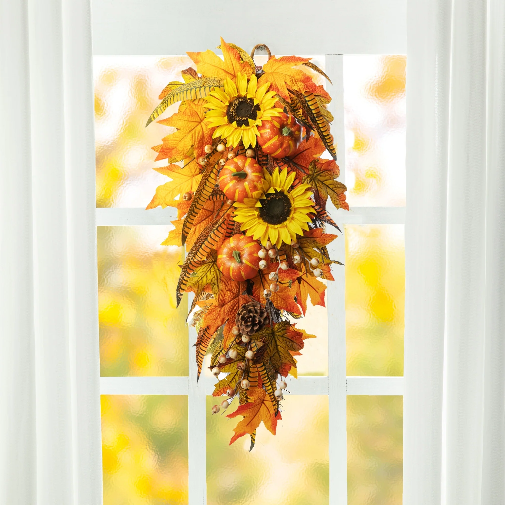 Glitzhome 26H Fall Sunflower Pumpkin Lotus Leaf Teardrop Swag for Thanksgiving
